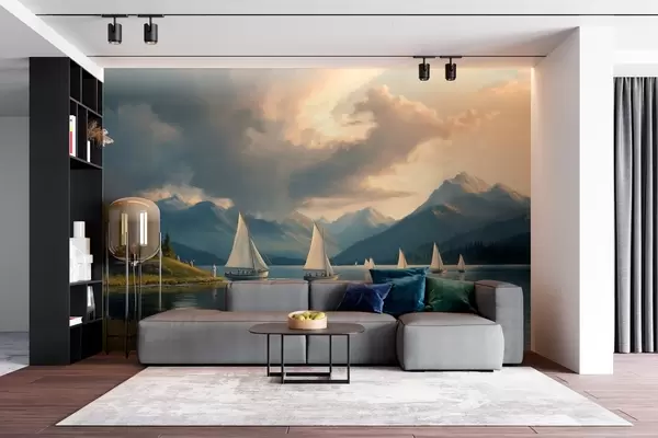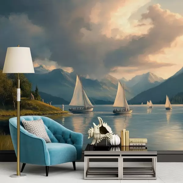 Peintures murales régate sur un lac avec un ciel nuageux dans le style d'une peinture à l'huile du 19ème siècle Nr. w04076