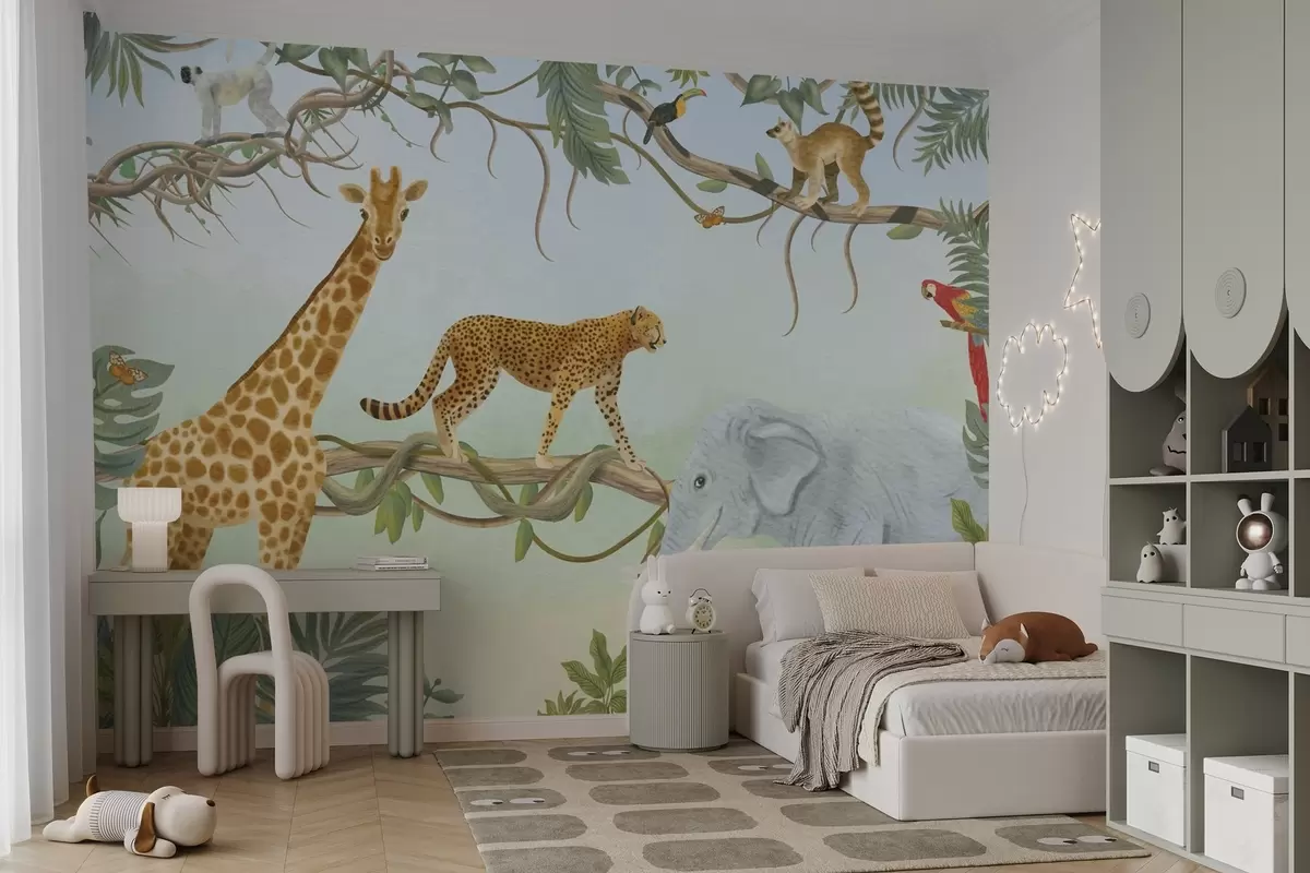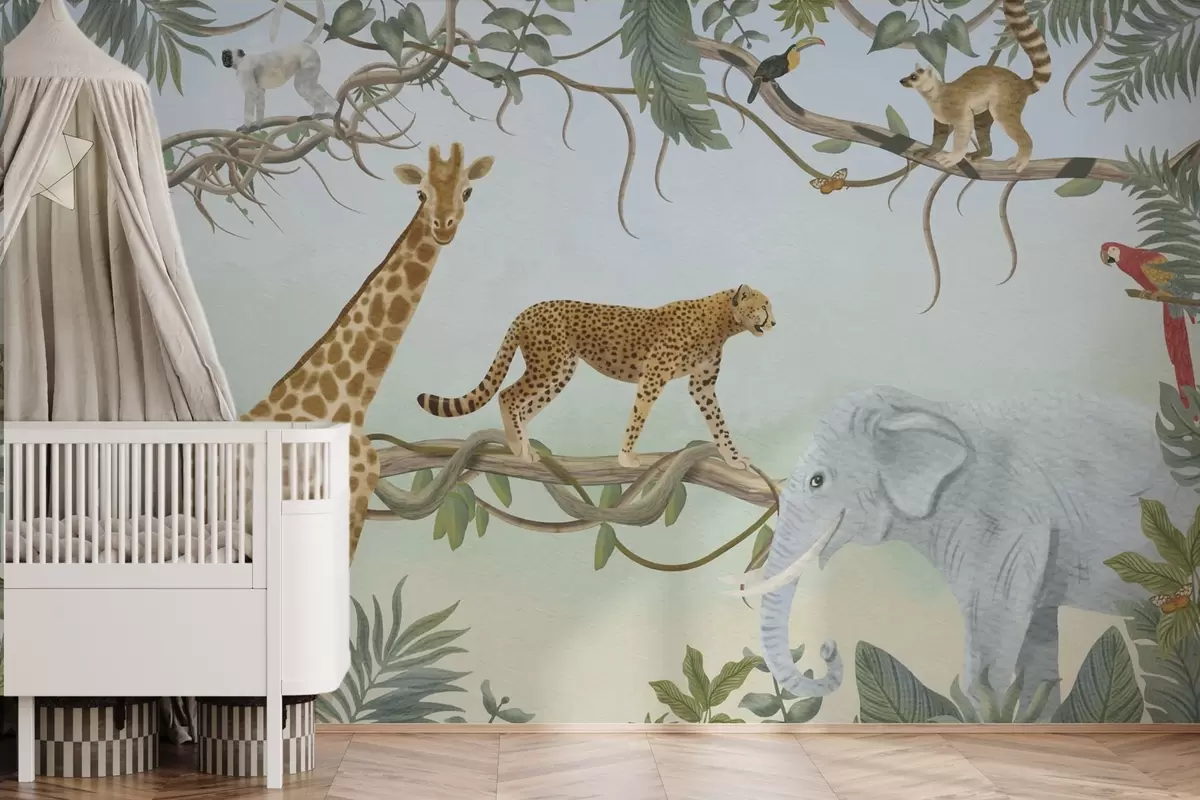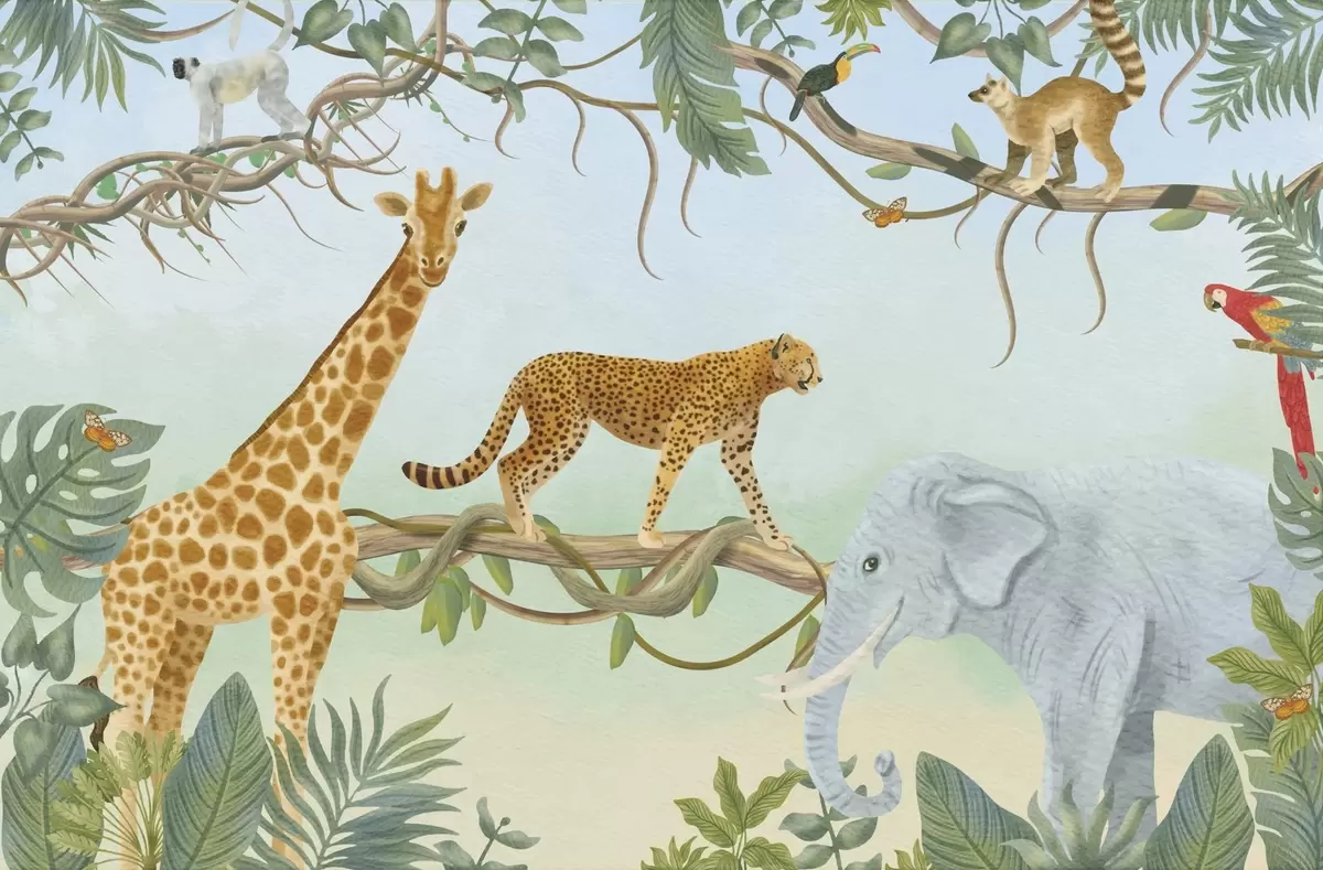 Peintures murales Illustration de la jungle avec girafe, guépard et éléphant Nr. w04194