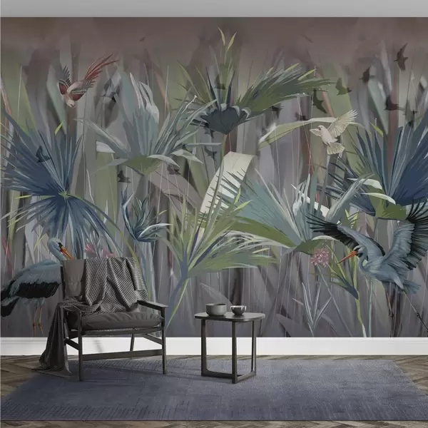 Peintures murales Oiseaux exotiques parmi les feuilles de palmier et les fleurs Nr. w04458