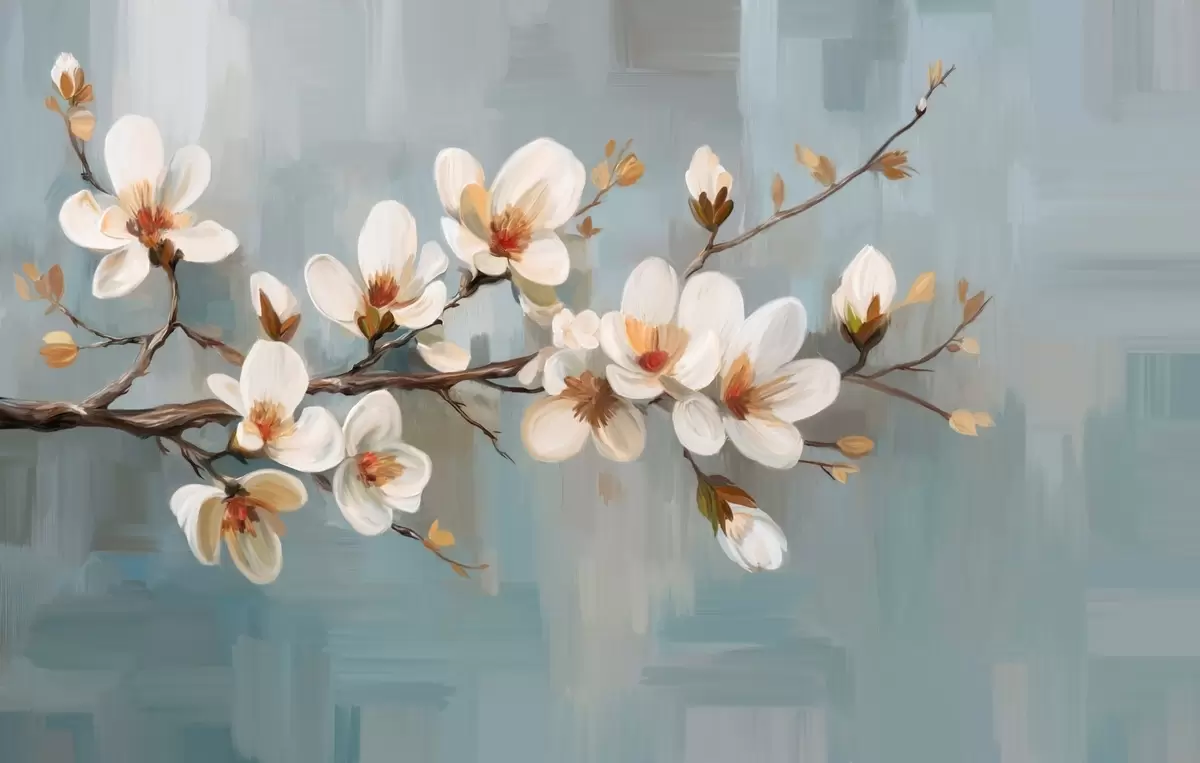 Peintures murales Branche fleurie dans le style de la peinture à l'huile sur fond bleu Nr. w04496