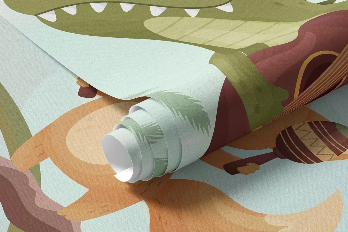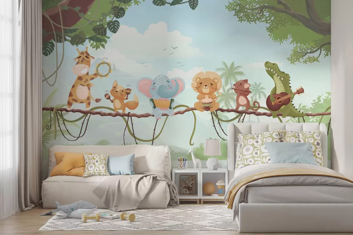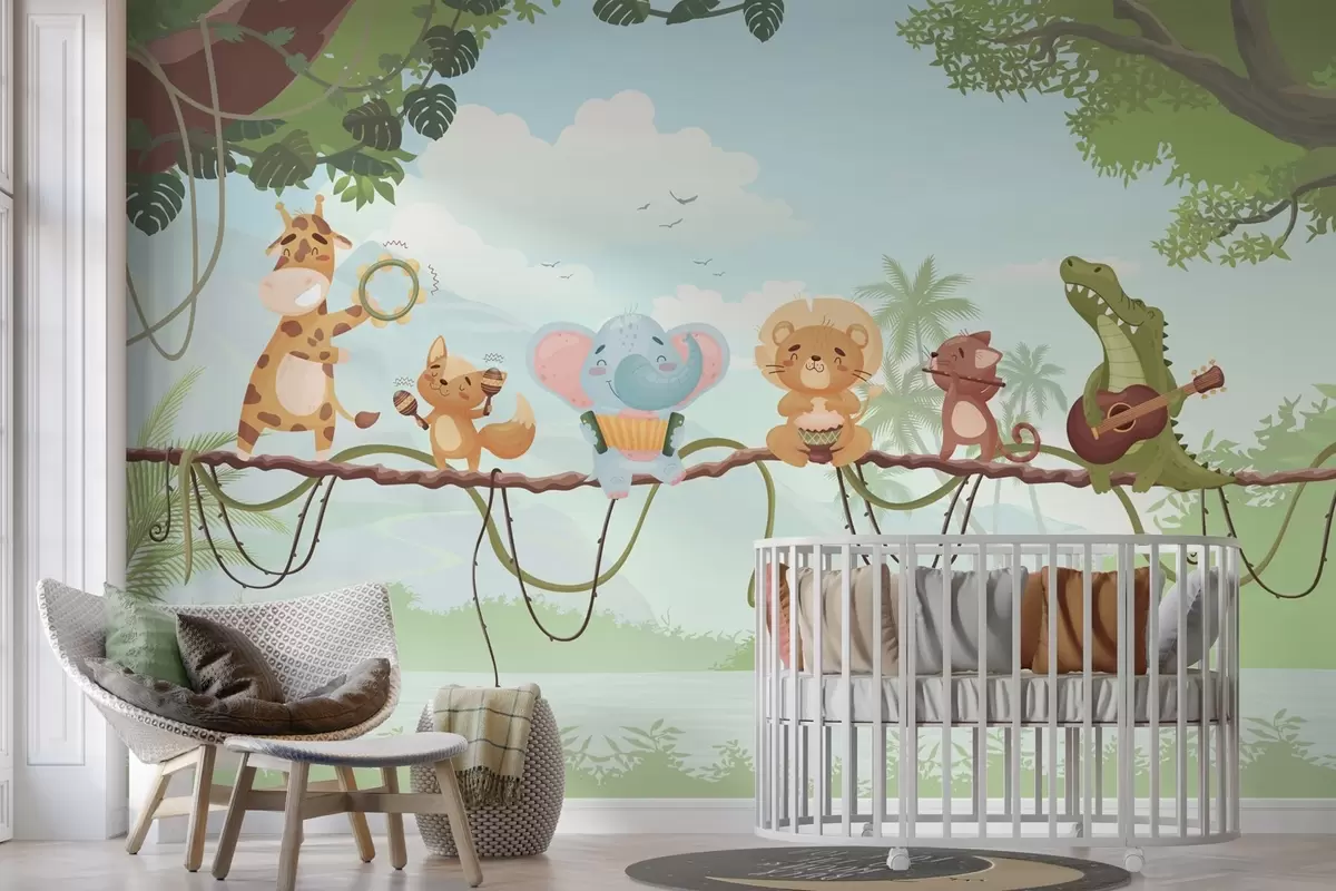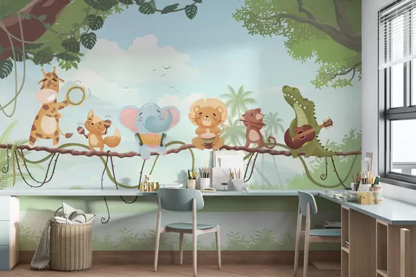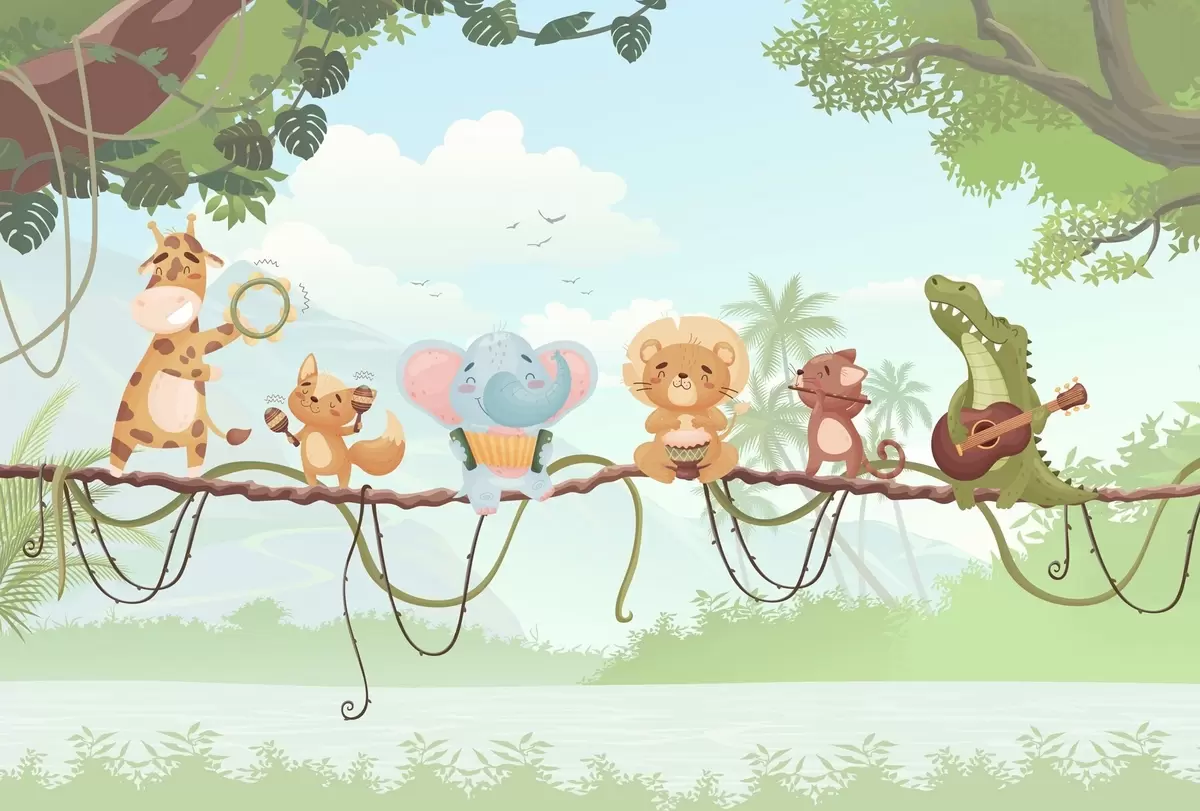 Peintures murales Animaux avec des instruments de musique dans un paysage tropical Nr. w04505