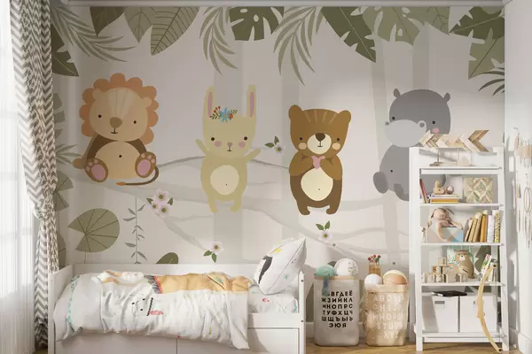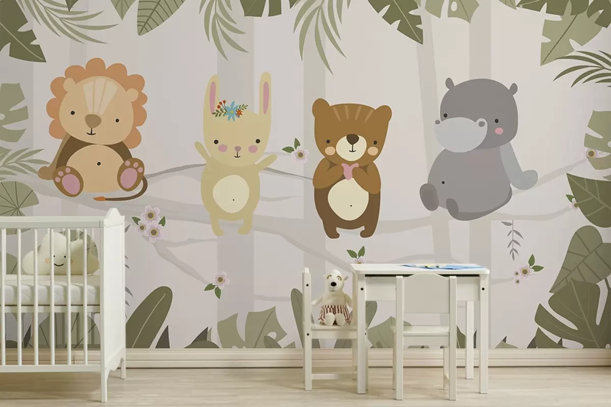 Peintures murales Adorable lion, lapin, ours et hippopotame parmi les feuilles Nr. w04682