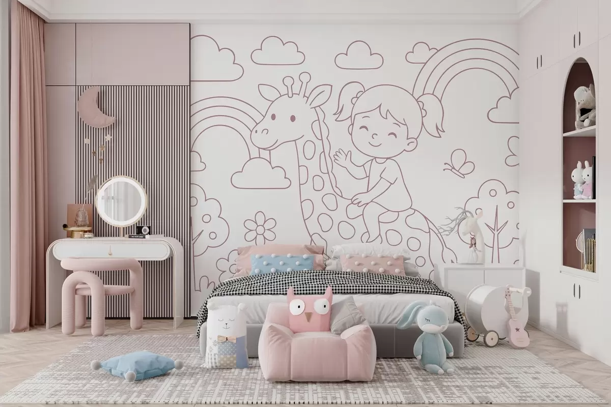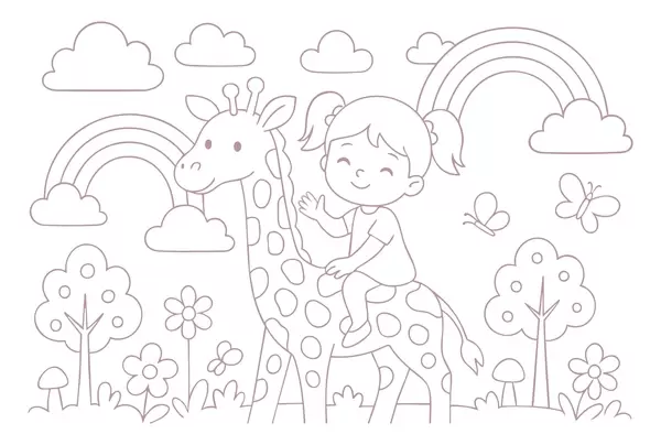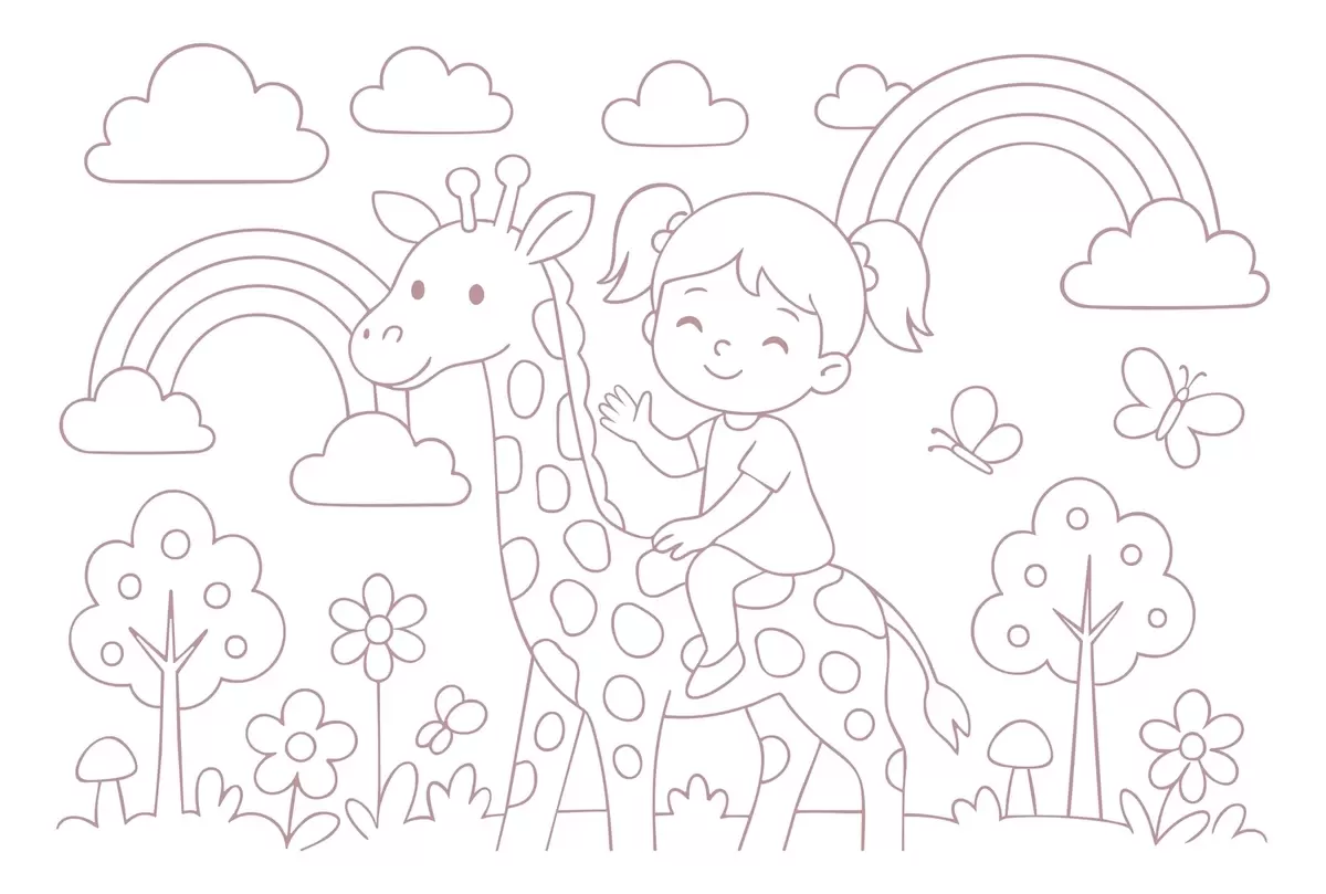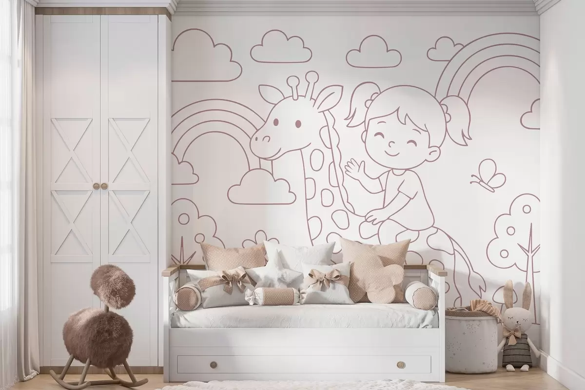 Peintures murales peinture à la poudre représentant une fille sur une girafe, dans le style d'un livre de coloriage pour enfants Nr. w04753v1
