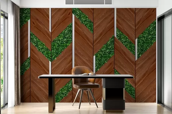 Peintures murales imitation de panneaux en bois foncé avec inserts végétaux Nr. w04875v1