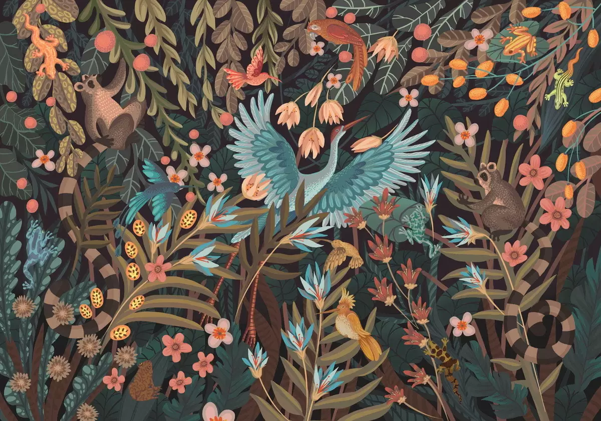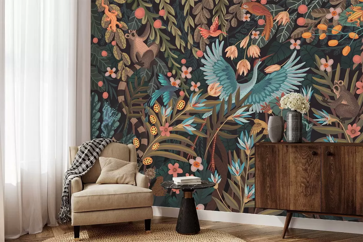 Peintures murales Scène fantastique avec des oiseaux et des animaux parmi les plantes Nr. w05024