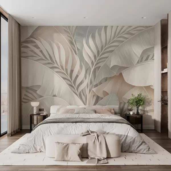 Peintures murales grandes feuilles tropicales dans les tons pêche et turquoise mat Nr. w05062