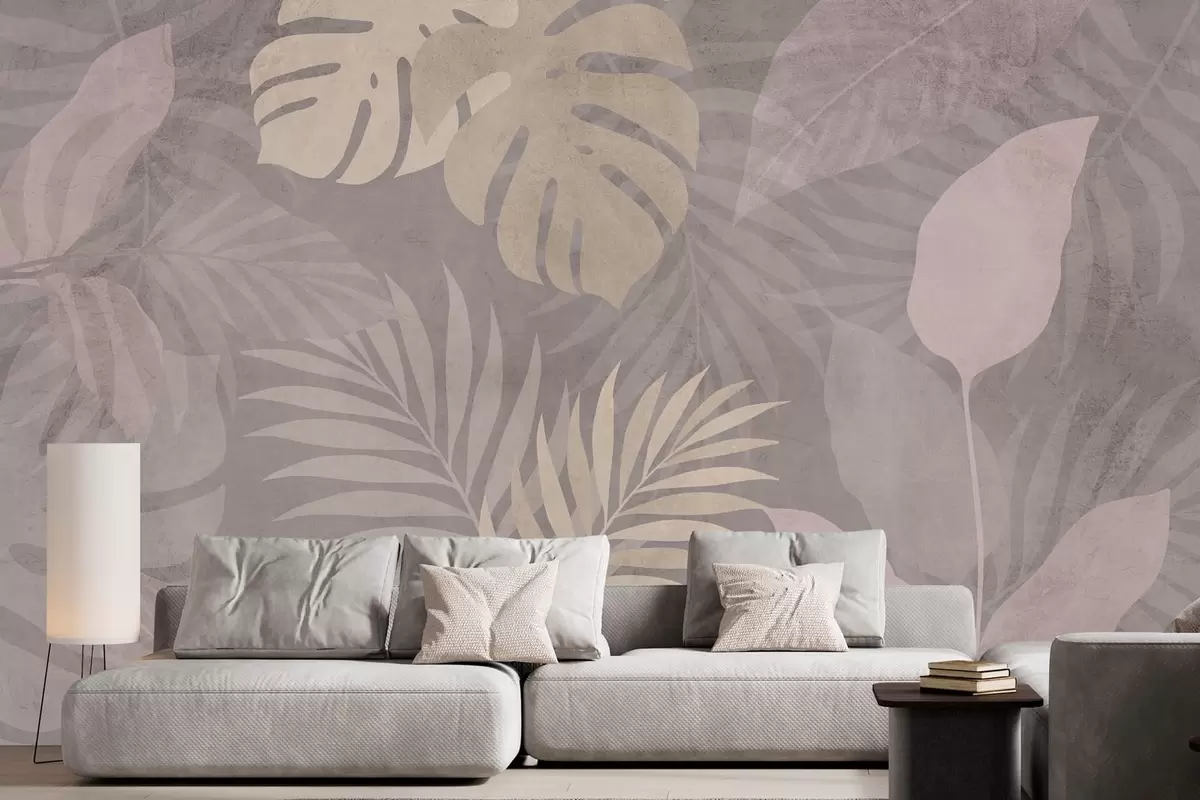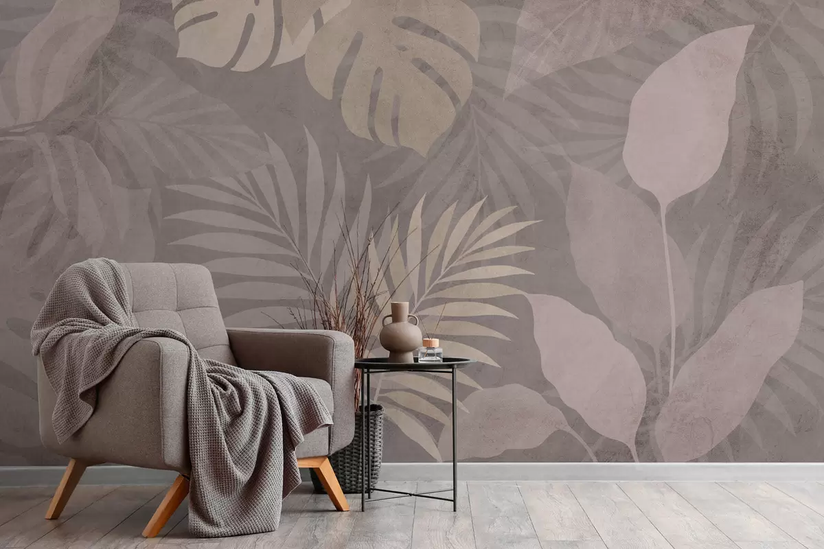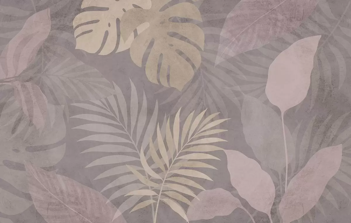 Peintures murales feuilles tropicales texturées sur fond gris Nr. w05063v1