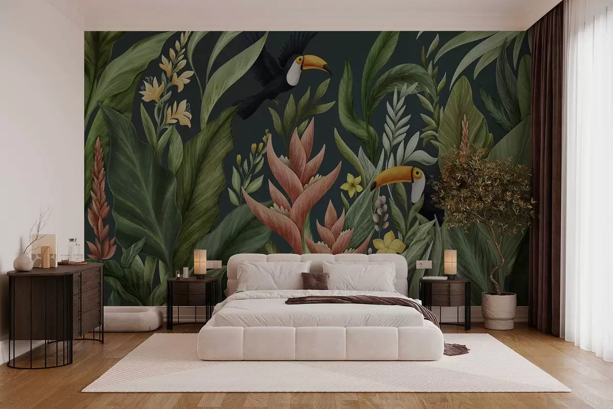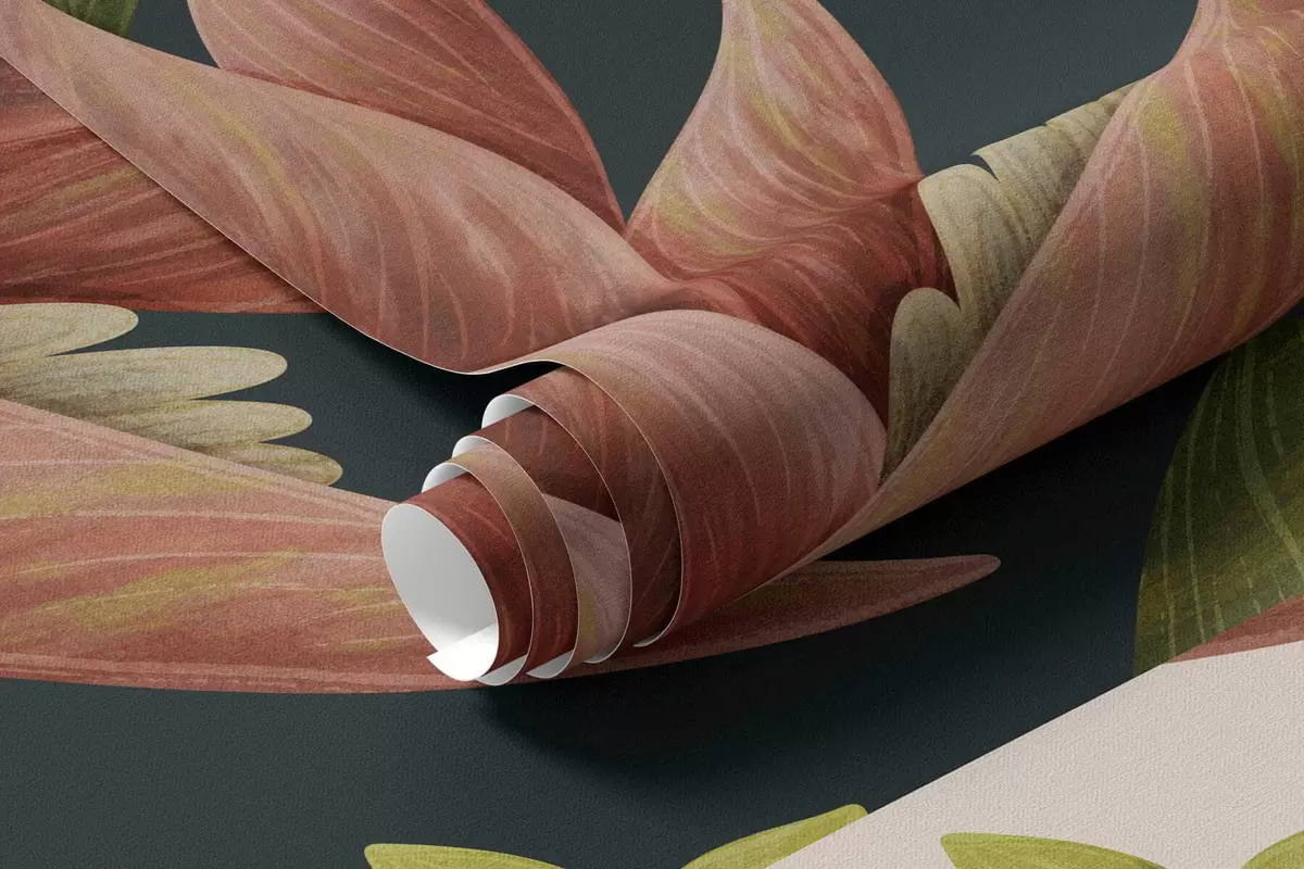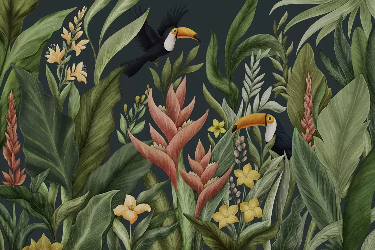 Peintures murales Plantes tropicales et oiseaux à long bec sur fond sombre Nr. w05088v2