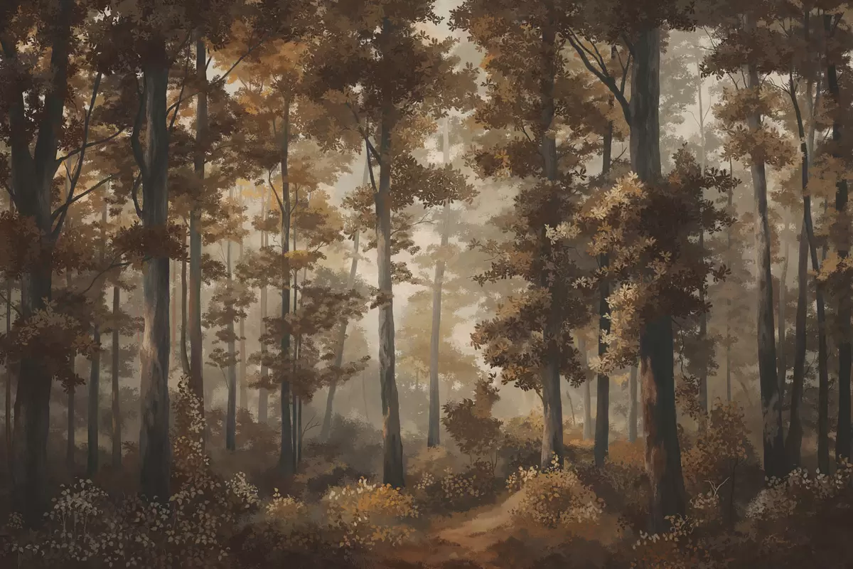 Peintures murales Scène automnale dans la forêt avec une lumière chaude et des arbres denses Nr. w05089v1