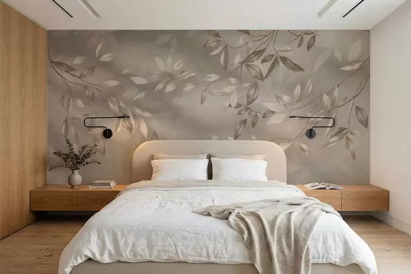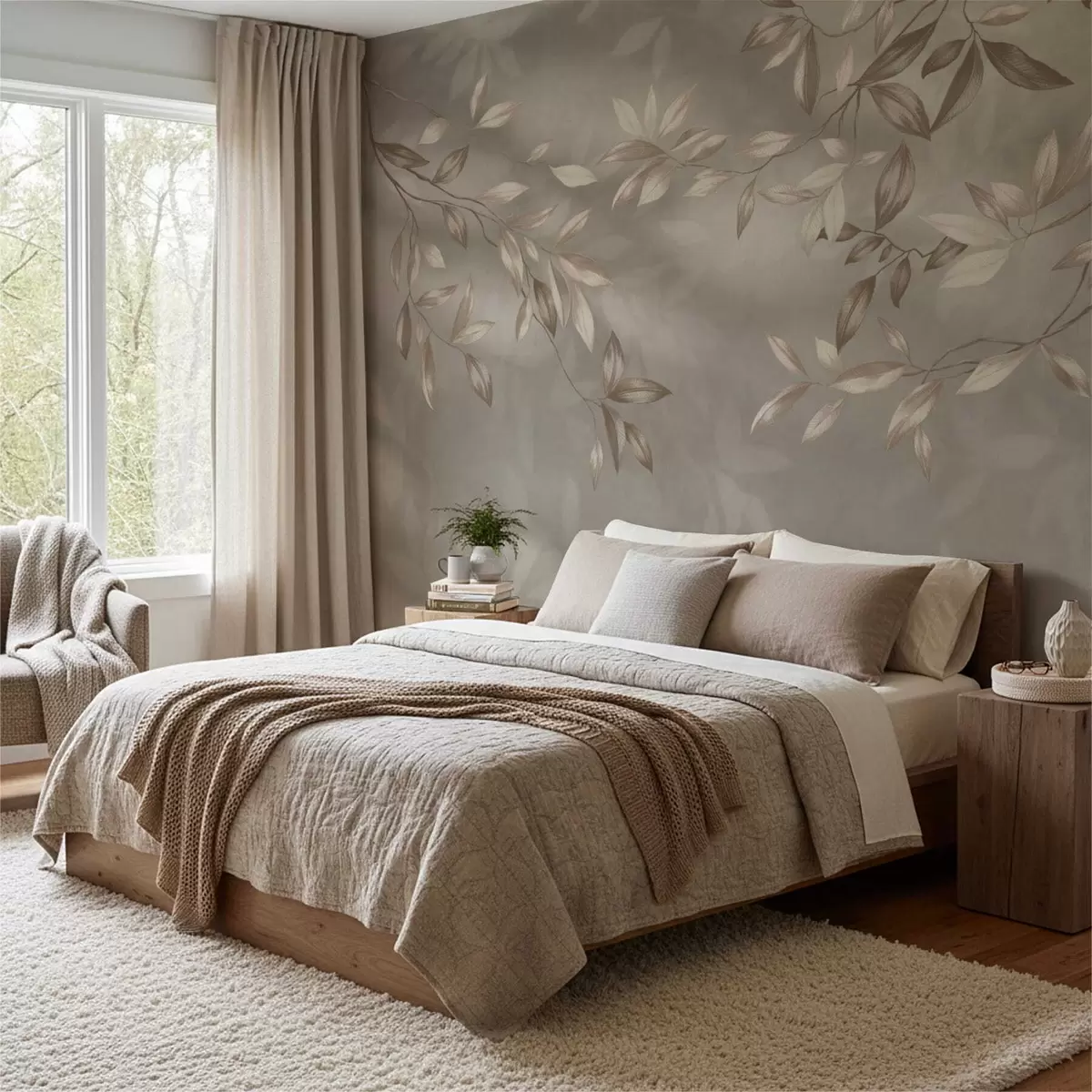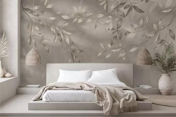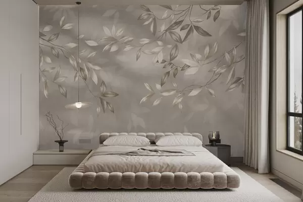 Peintures murales Élégantes branches feuillues dans des tons beiges sur fond clair Nr. w05113