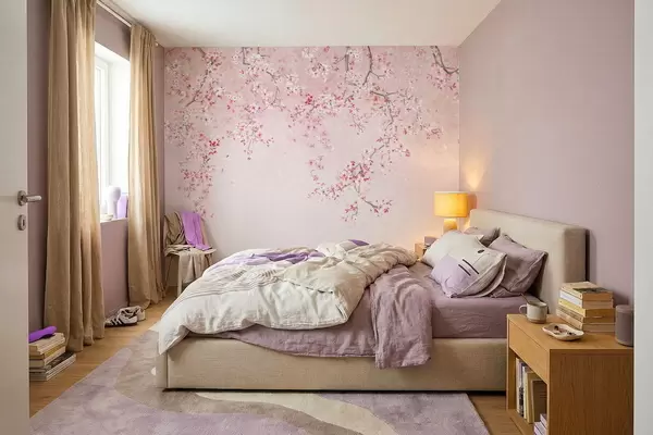 Peintures murales Branches avec des fleurs roses sur un fond pastel doux Nr. w05129v1