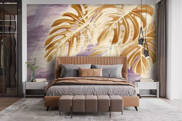Peintures murales Feuilles dans des tons orange chauds sur fond violet Nr. w05130v2