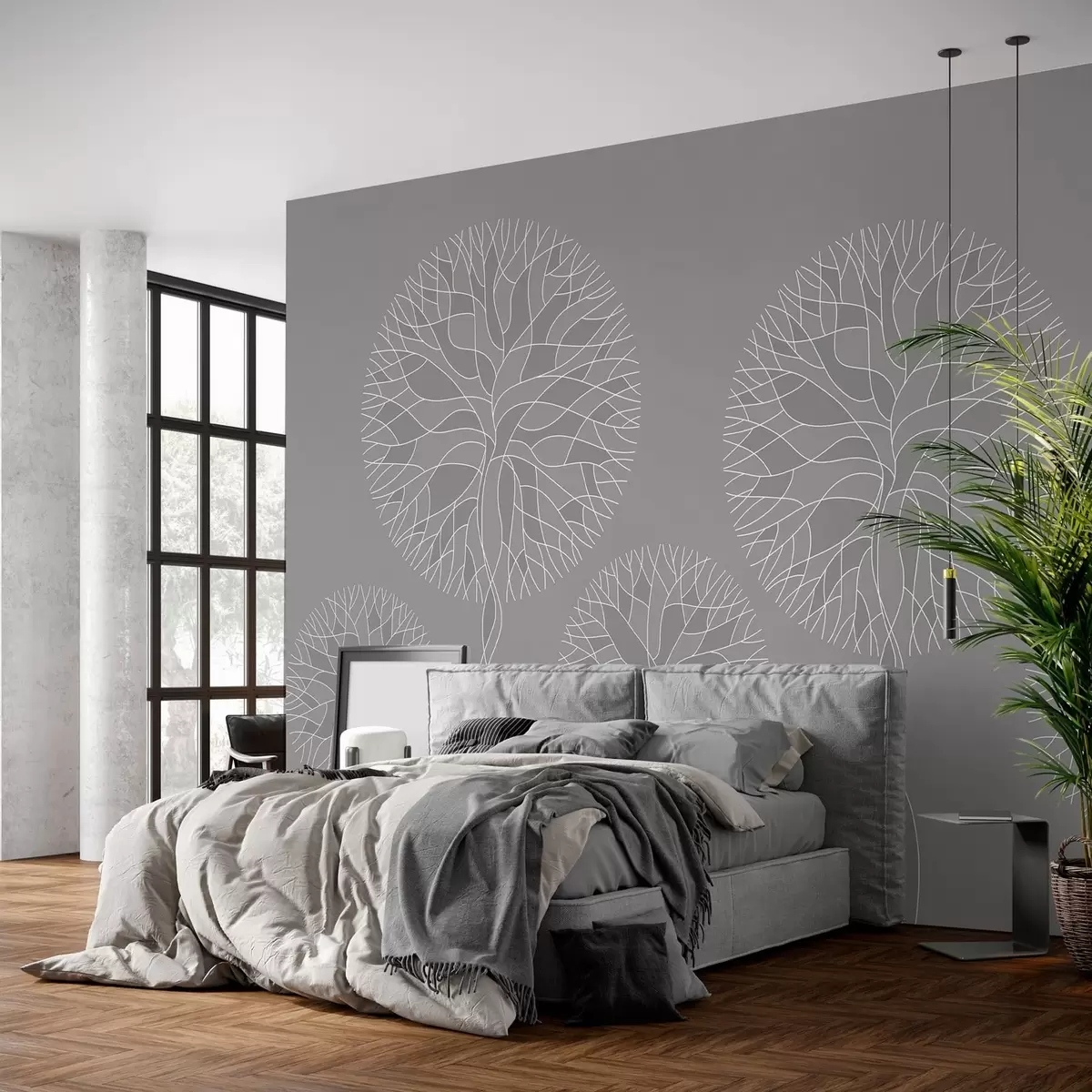 Peintures murales Arbres fantaisistes linéaires aux couronnes luxuriantes dans des tons gris moyens Nr. w05213v5