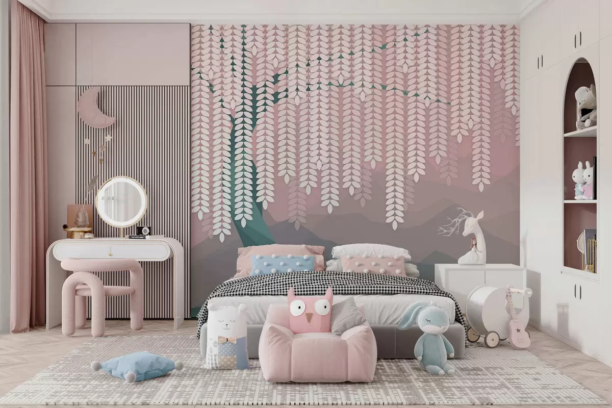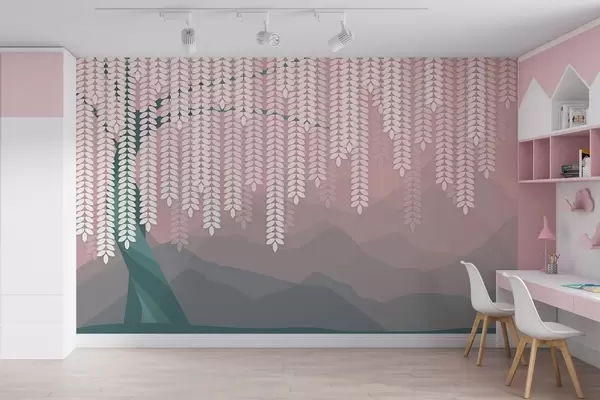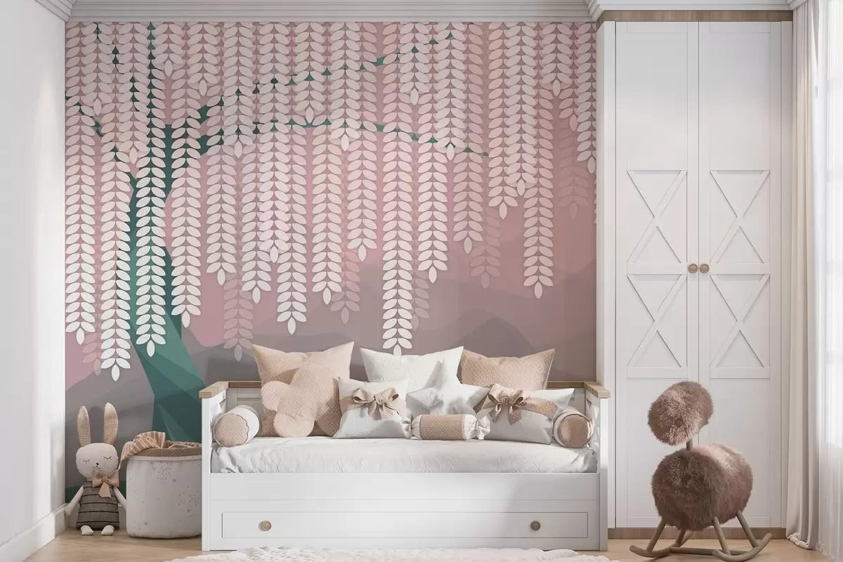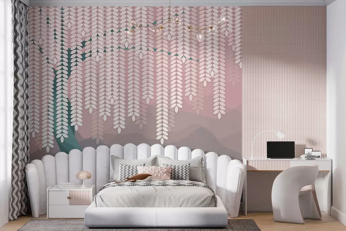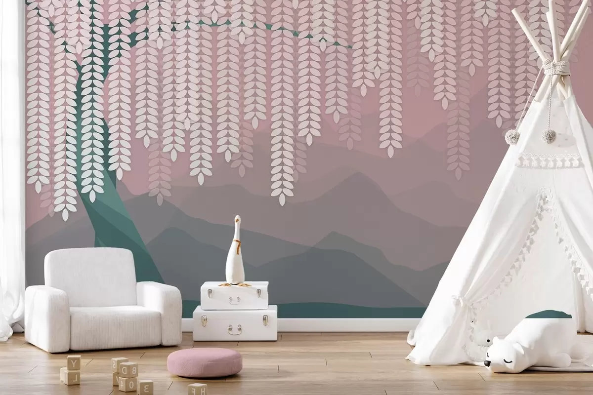 Peintures murales Saule stylisé aux feuilles pendantes sur fond de montagnes minimalistes dans des tons rose et vert foncé. Nr. w05232v4