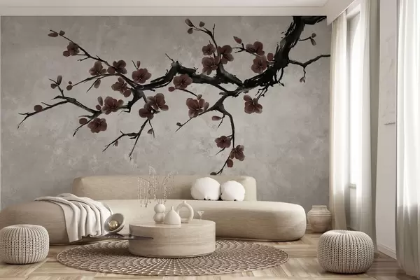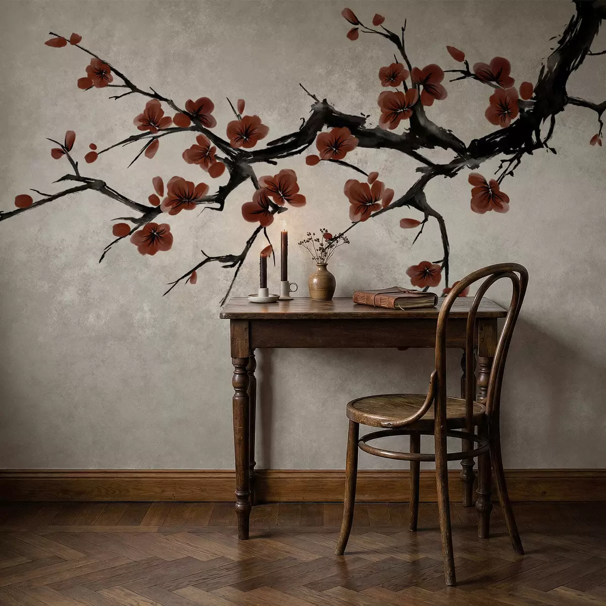 Peintures murales Branche aux fleurs rouge foncé sur fond neutre Nr. w05425v1