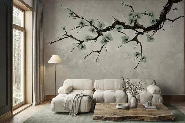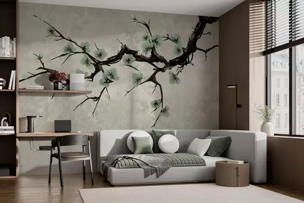 Peintures murales Branche aux fleurs vertes dans des tons apaisants Nr. w05425v2