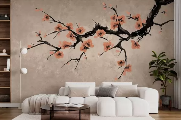 Peintures murales Branche fleurie de fleurs de pêcher sur fond texturé Nr. w05425v3