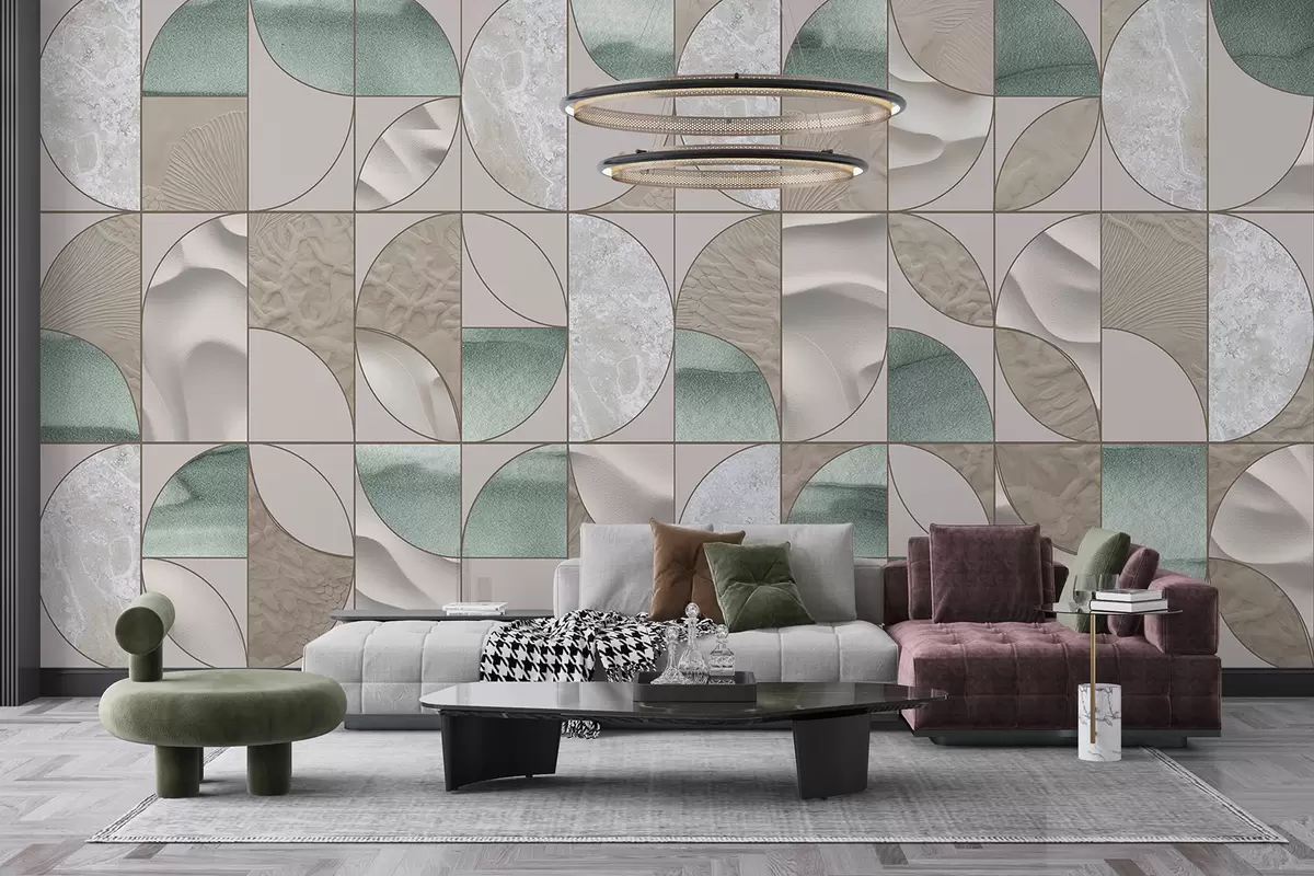 Peintures murales Un motif géométrique de textures vertes, beiges et blanches disposées dans un motif abstrait répétitif Nr. w07928