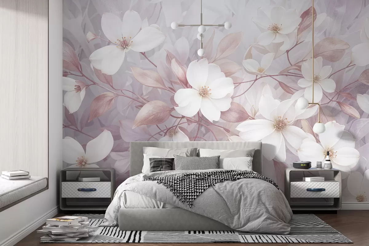 Peintures murales De délicates fleurs de magnolia roses et blanches fleurissent sur des branches douces et floues sur un fond pâle Nr. w08196