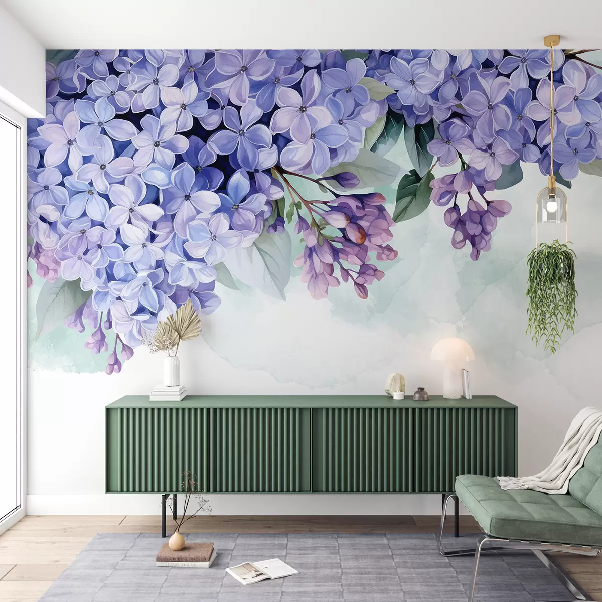 Peintures murales Fleurs d'hortensia violettes vibrantes avec des feuilles vertes, remplissant le cadre sur un fond doux et flou Nr. w08223