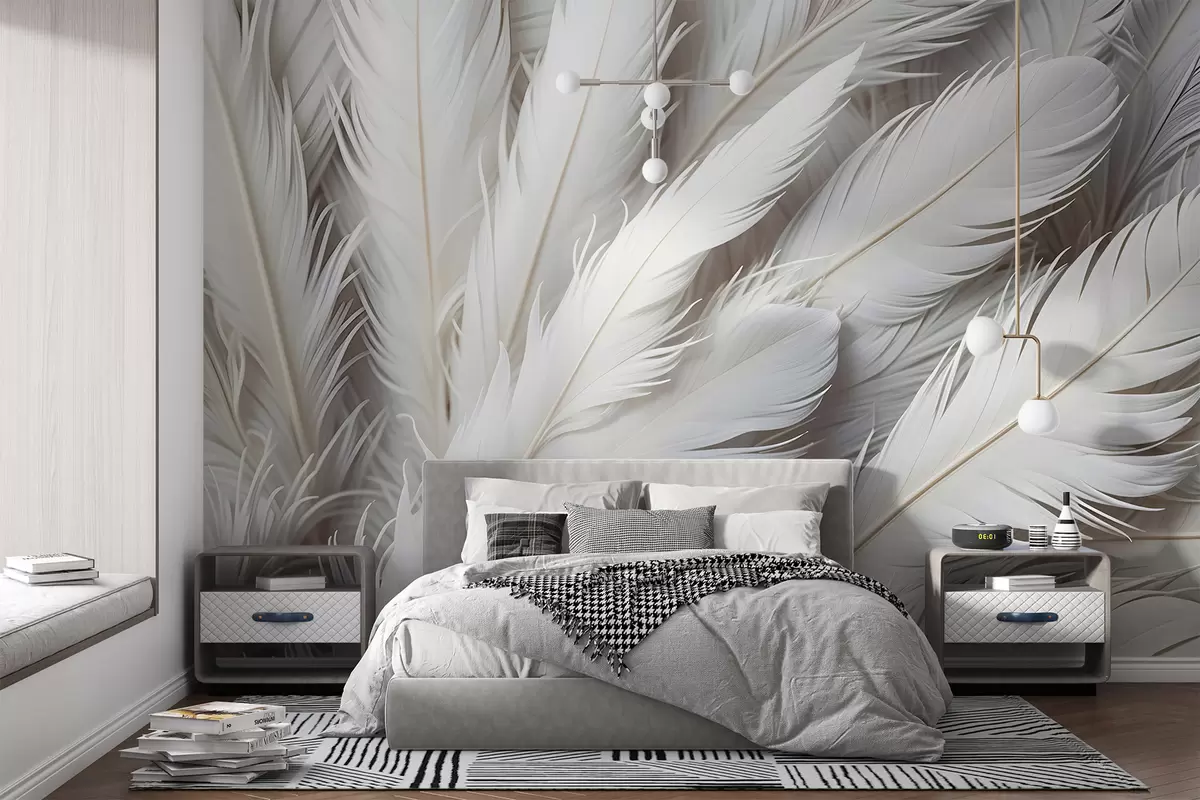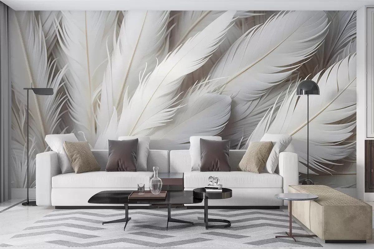 Peintures murales Plumes blanches douces et duveteuses avec une texture délicate et vaporeuse sur un fond clair Nr. w08319
