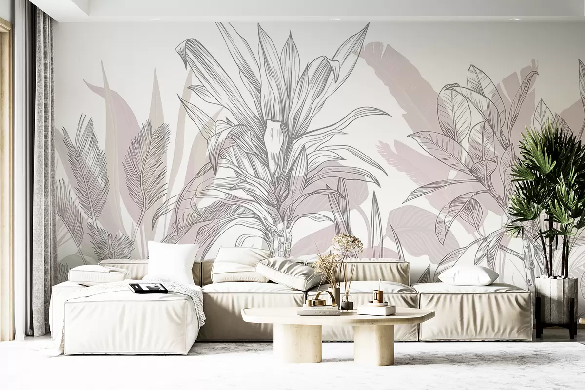 Peintures murales Plantes tropicales graphiques avec de grandes feuilles luxuriantes et des fleurs dans des tons gris et blancs avec des silhouettes florales roses Nr. w08327v1