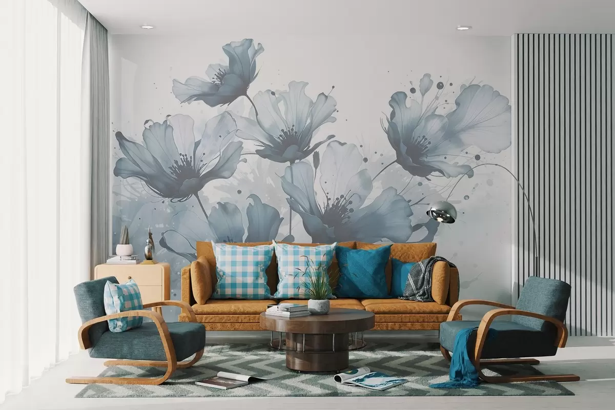 Peintures murales Fleurs bleues délicates avec des pétales doux et flous et des éclaboussures d'aquarelle sur un fond clair Nr. w08376