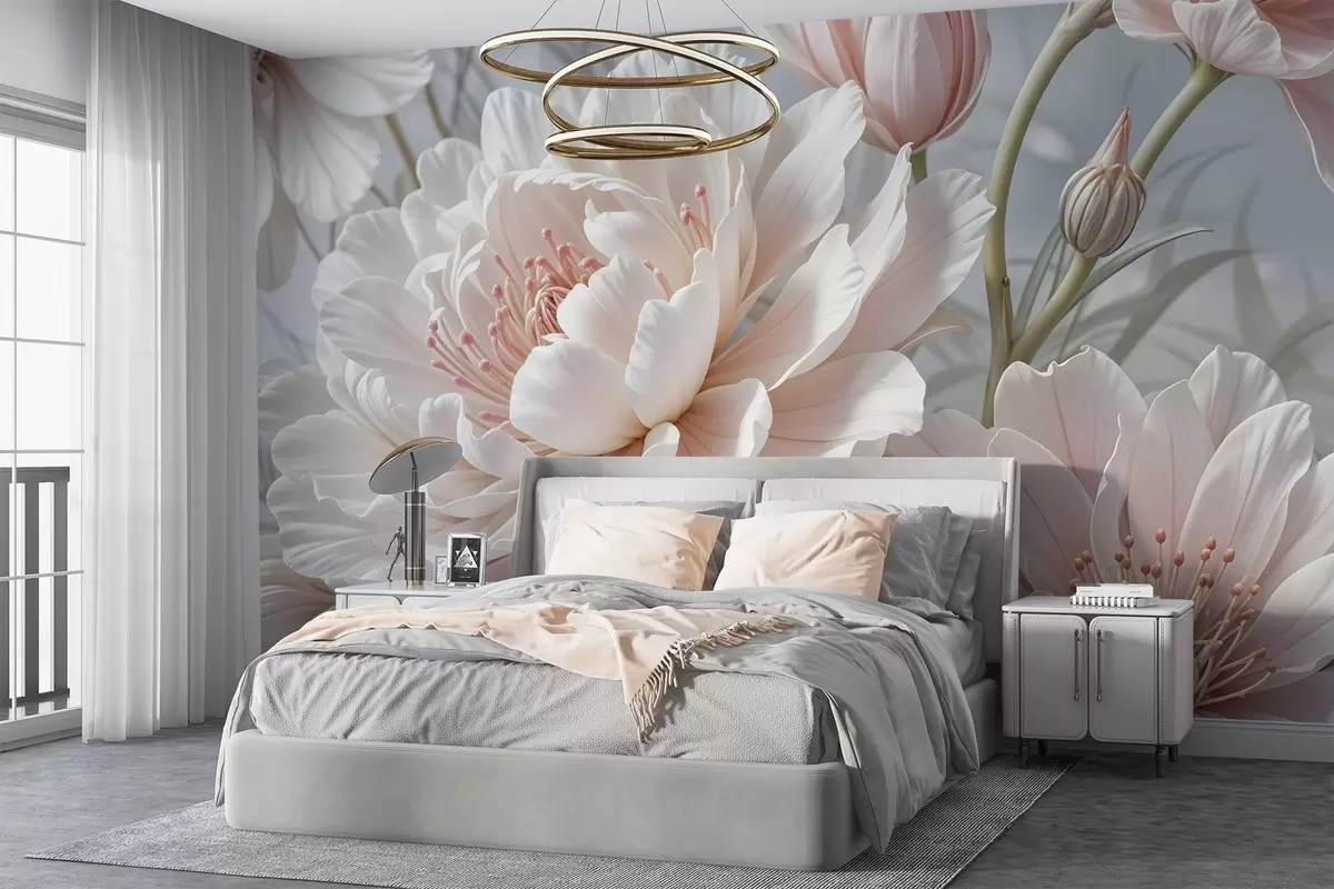 Peintures murales Grandes fleurs délicates de pivoines blanches et roses aux pétales doux et duveteux sur un fond gris flou Nr. w08427