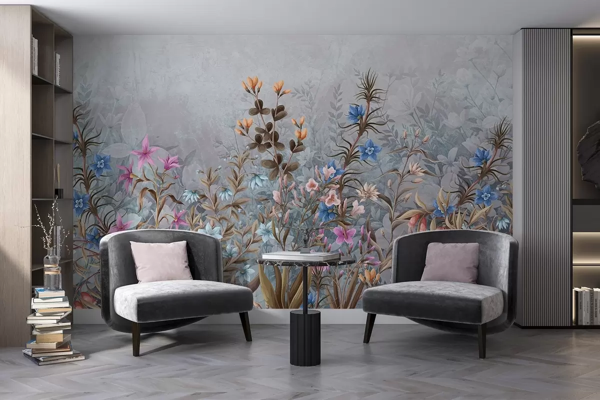 Peintures murales Un imprimé floral luxuriant et vibrant avec des fleurs et des plantes colorées aux détails et aux textures complexes Nr. w08428