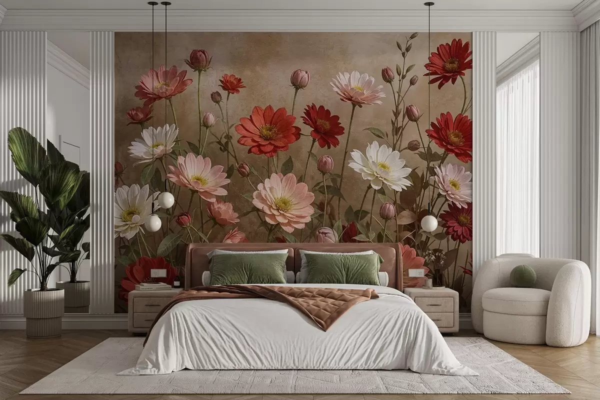 Peintures murales Un champ de fleurs colorées ressemblant à des marguerites dans différentes nuances de rose, de rouge et de blanc sur un fond texturé Nr. w08462
