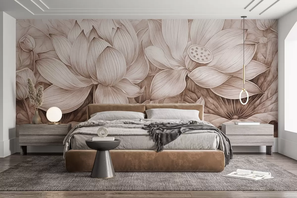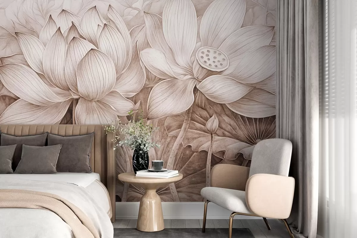 Peintures murales Plusieurs grandes fleurs de lotus beiges texturées et détaillées avec des feuilles et des tiges brunes sur un fond clair Nr. w08465v1