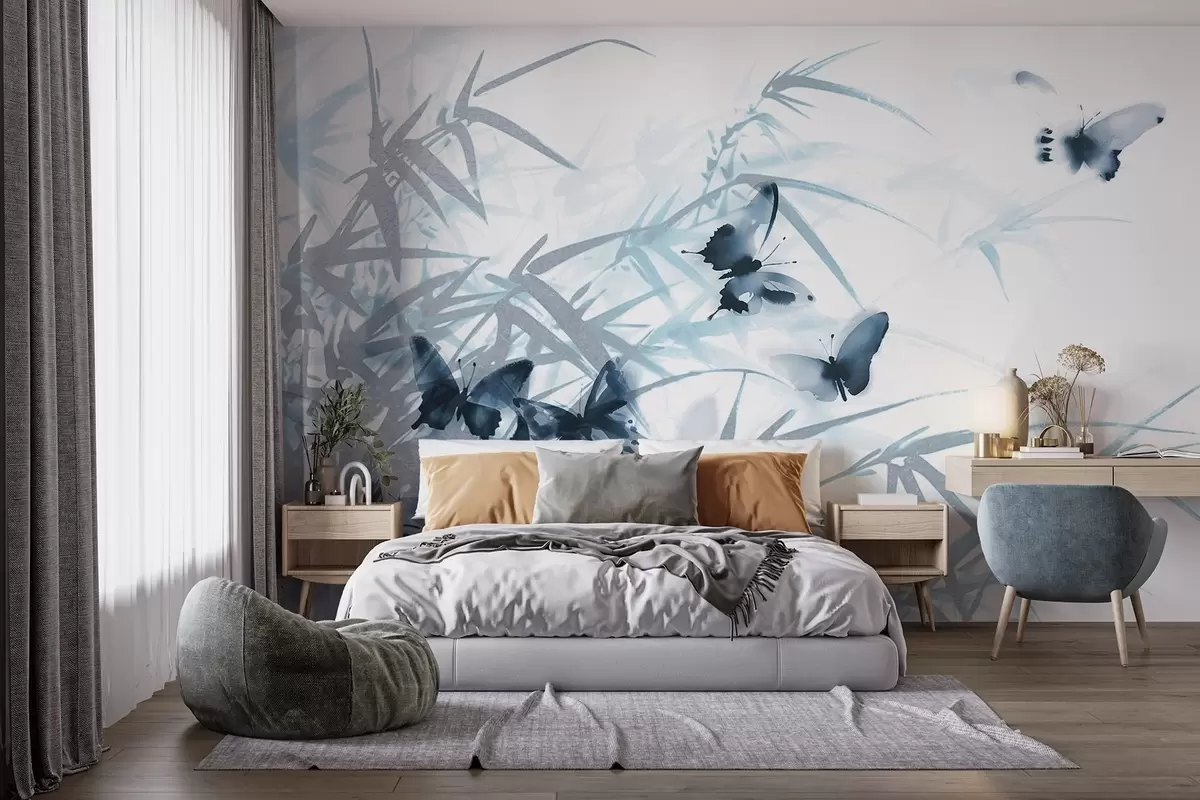Peintures murales Feuilles et tiges de bambou texturées avec des papillons bleus volants aux ailes transparentes Nr. w08524
