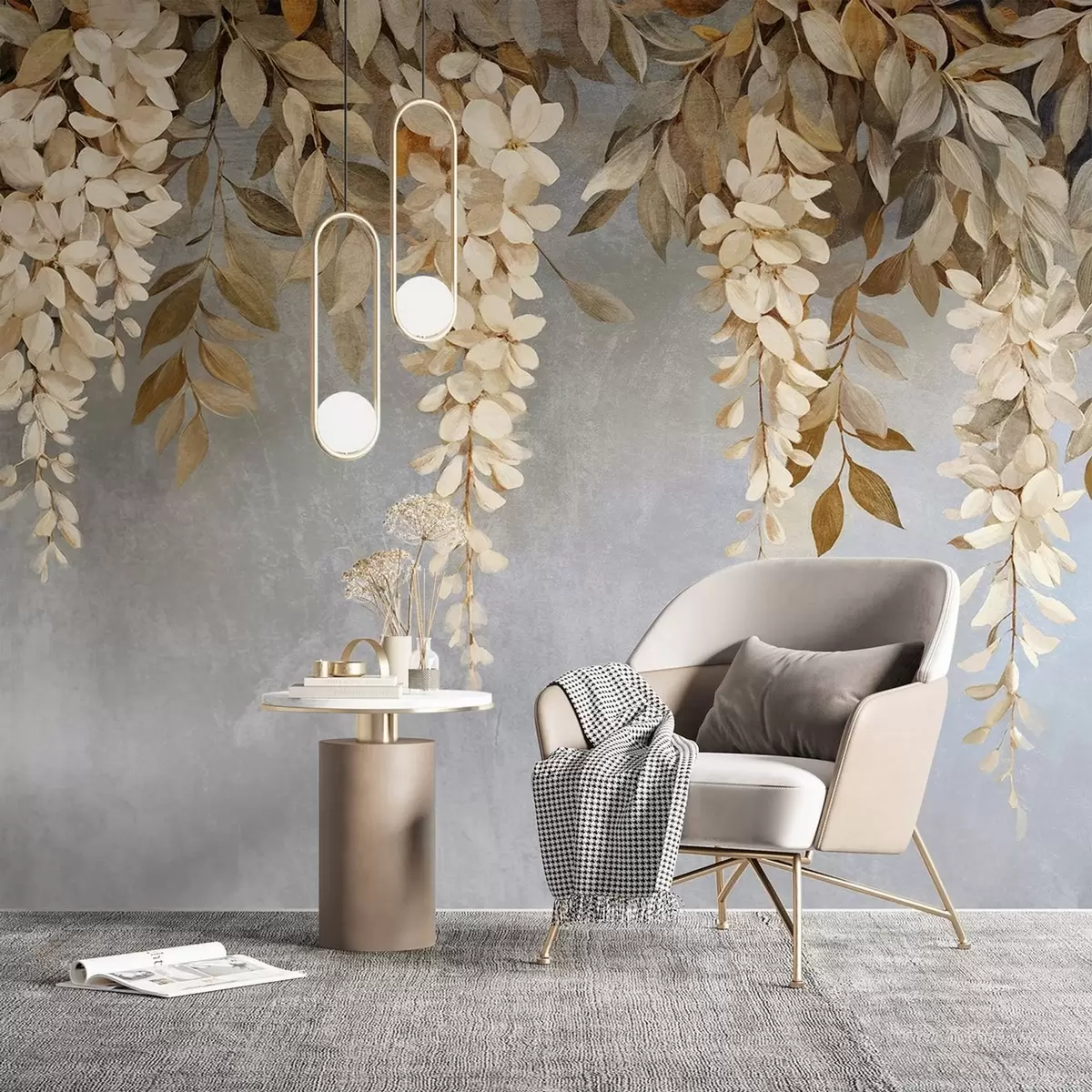 peintures murales Délicates fleurs de glycine blanches et beige clair avec leur feuillage tombant en cascade sur un fond gris doux w08531