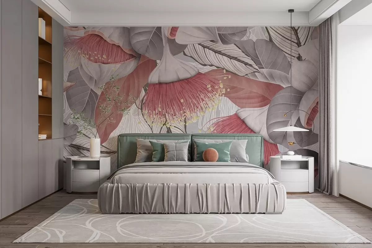Peintures murales Illustration botanique de grandes fleurs d'eucaliptus aux longues étamines sur fond gris et blanc Nr. w08539