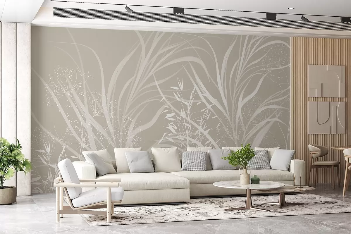 Peintures murales Délicate impression florale moderne et minimaliste en blanc sur un fond beige pastel clair Nr. w08583