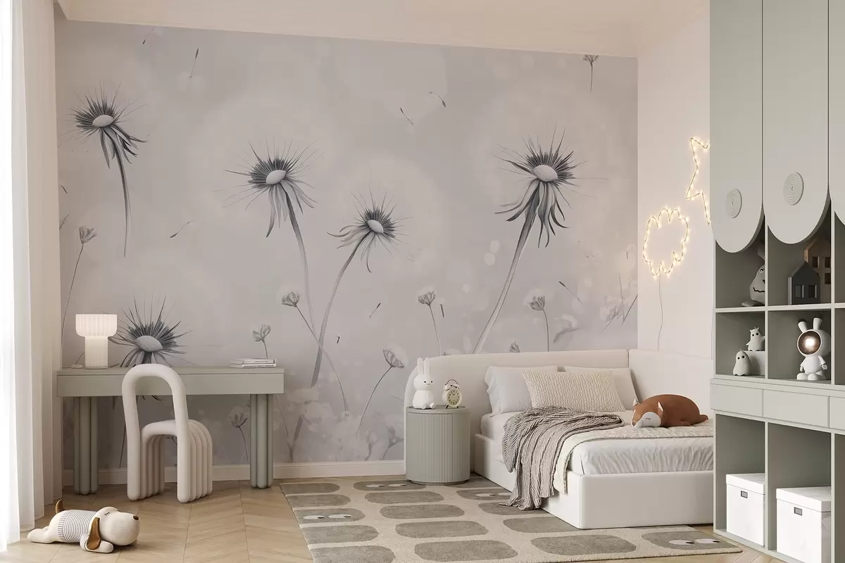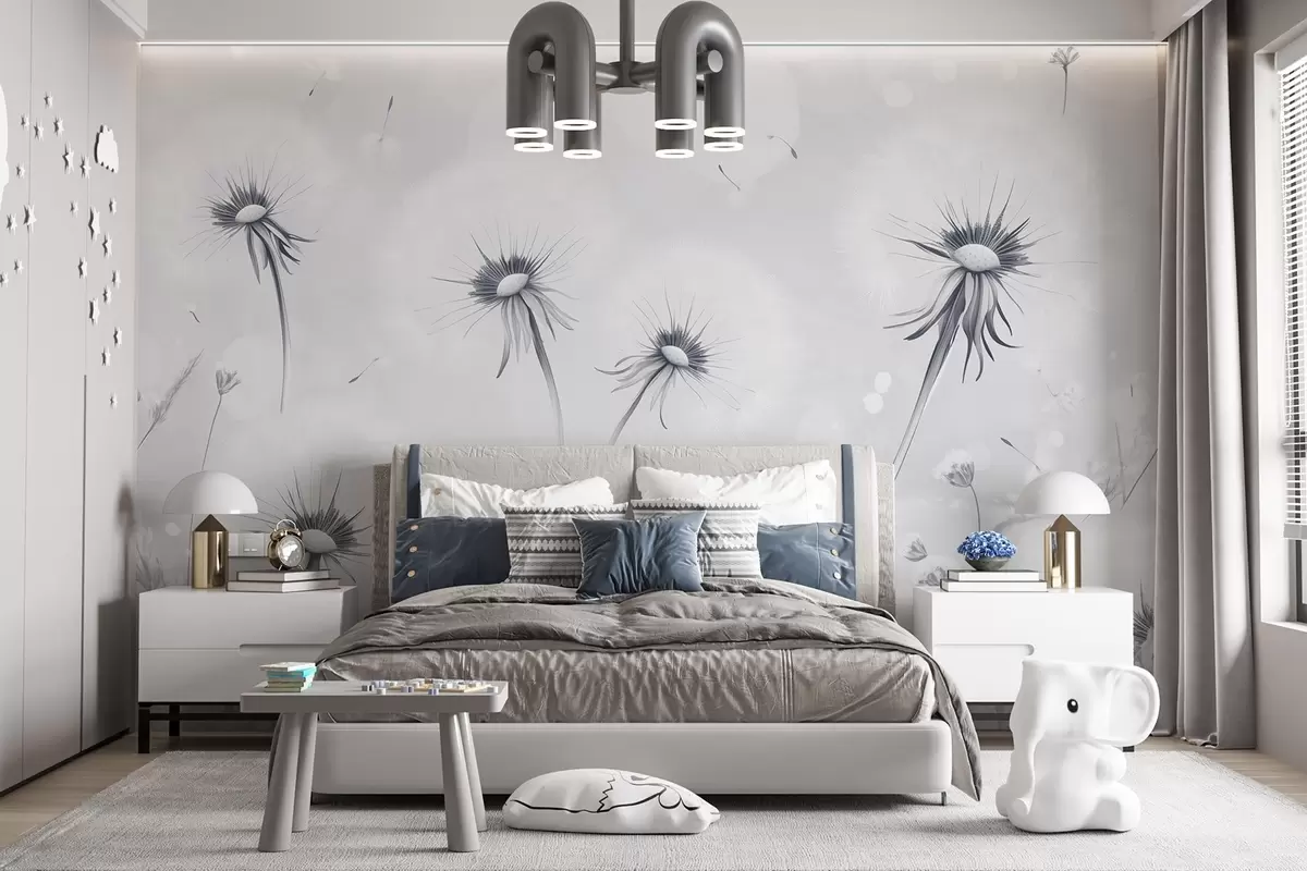 Peintures murales Élégants pissenlits et fleurs sauvages dans un style pictural dans les tons bleus Nr. w08657v2