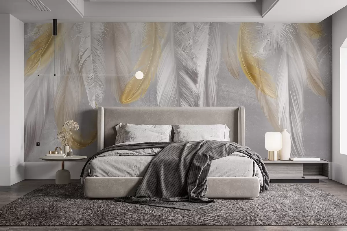 Peintures murales Plumes blanches et jaunes suspendues sur un fond gris doux, créant une composition délicate et aérienne Nr. w08670