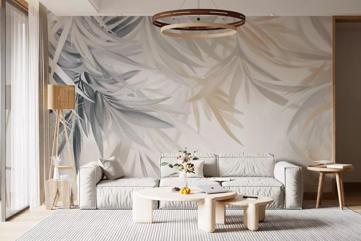Peintures murales Feuilles tropicales douces et fluides de couleur claire dans des tons gris et pêche, se fondant dans un imprimé pâle et neutre Nr. w08703
