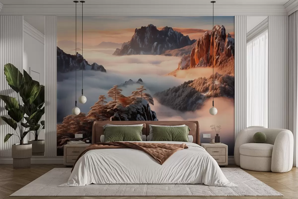 Peintures murales Charmant paysage de montagne avec brume et arbres Nr. w08807
