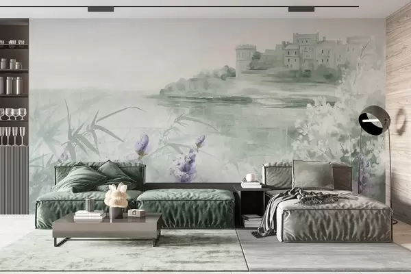 Peintures murales Paysage vintage texturé avec un château sur une falaise surplombant la mer, avec des fleurs de lavande dans des couleurs sourdes Nr. w08975