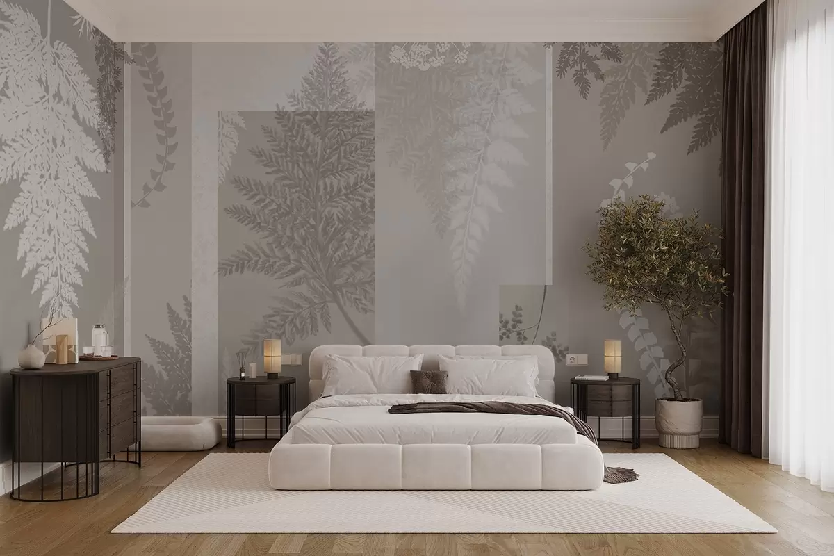 Peintures murales Feuilles de fougère en beige et blanc, disposées en bandes verticales, créant un imprimé botanique et minimaliste, aux couleurs douces et sourdes Nr. w09007