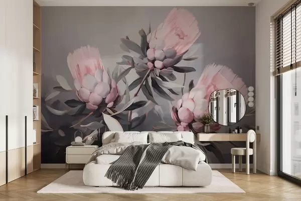 Peintures murales Fleurs abstraites de protea rose avec des feuilles grises, coups de pinceau doux et texturés, couleurs sourdes, sur un fond gris flou Nr. w09014
