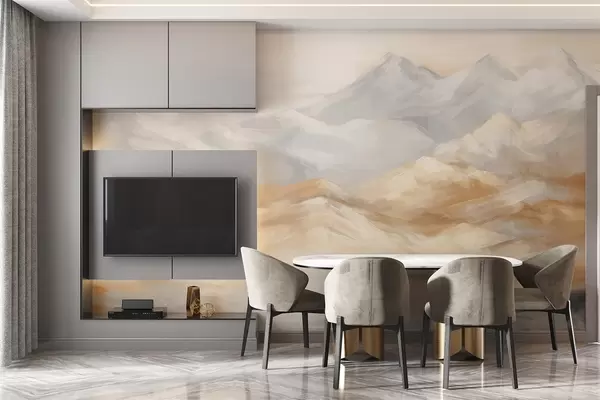 peintures murales Peinture de paysage texturée représentant des montagnes avec un lac au premier plan, dans des tons de blanc, de gris et de brun w09057