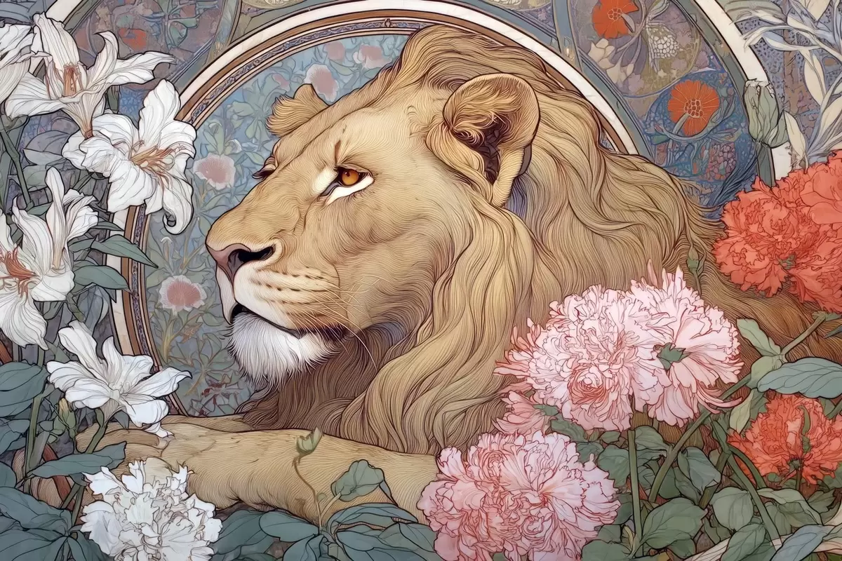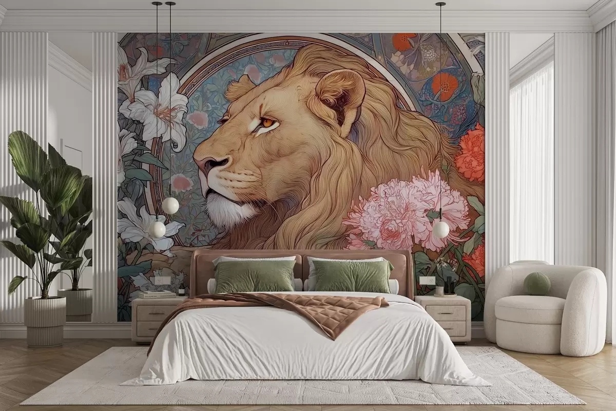 Peintures murales Un lion entouré de nombreuses fleurs dans le style d'Alphonse Mucha Nr. w09073