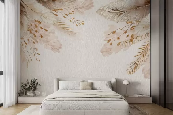 Peintures murales Herbe de la pampa et plumes à l'aquarelle en beige et blanc sur papier Nr. w09079
