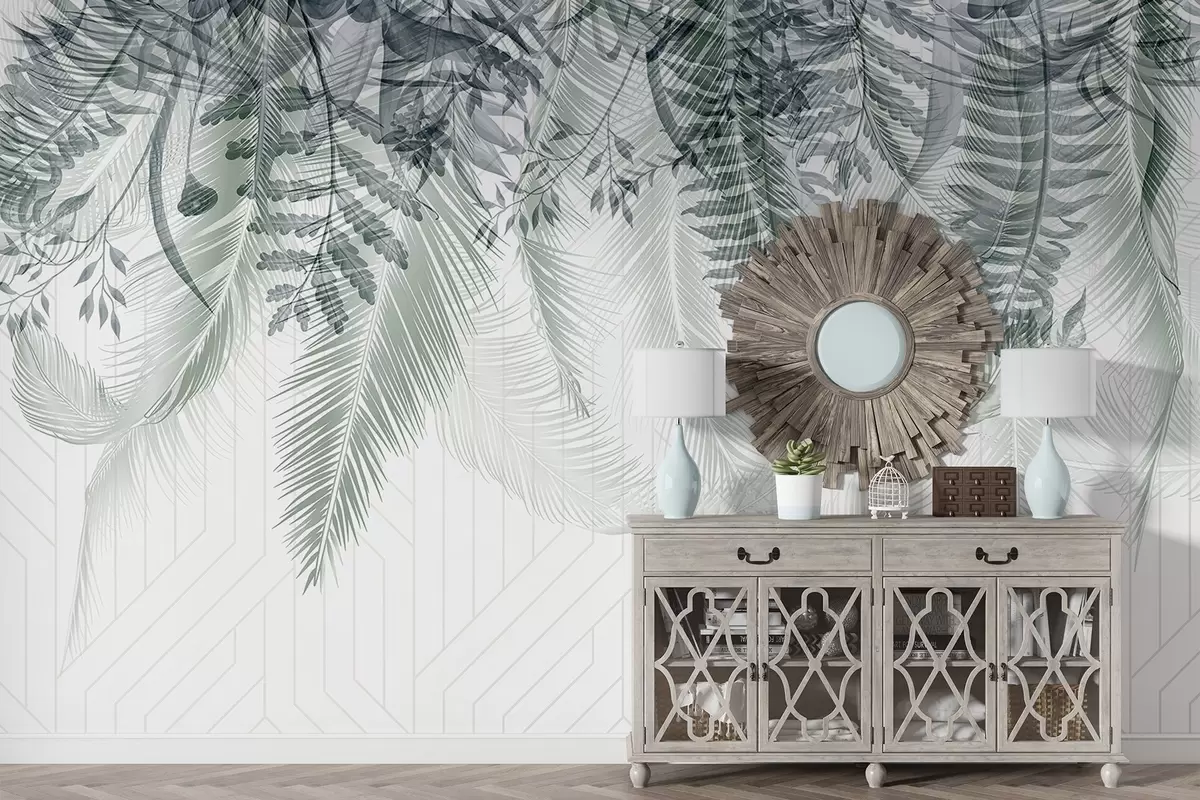 Peintures murales Délicate chute de fougères tropicales et de feuilles de palmier, arrière-plan géométrique, lumière douce, couleurs sourdes, élégant Nr. w09106