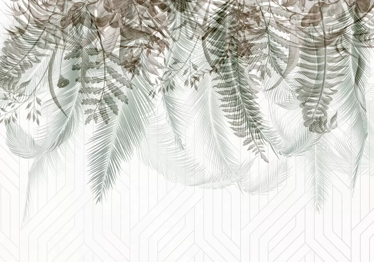 Peintures murales Délicate chute de fougères tropicales et de feuilles de palmier, arrière-plan géométrique, lumière douce, couleurs sourdes, élégant Nr. w09106v1