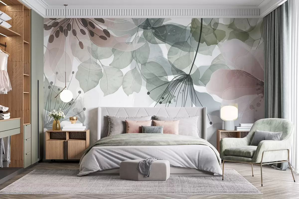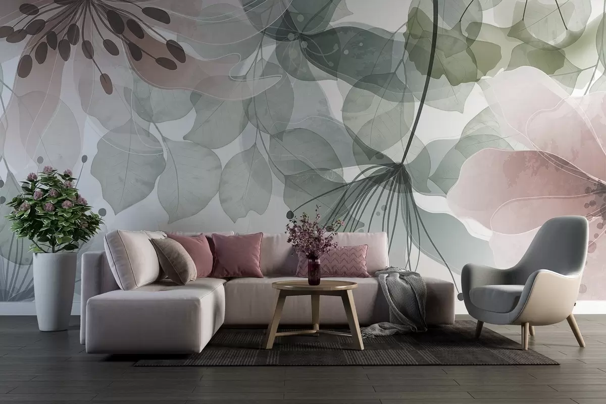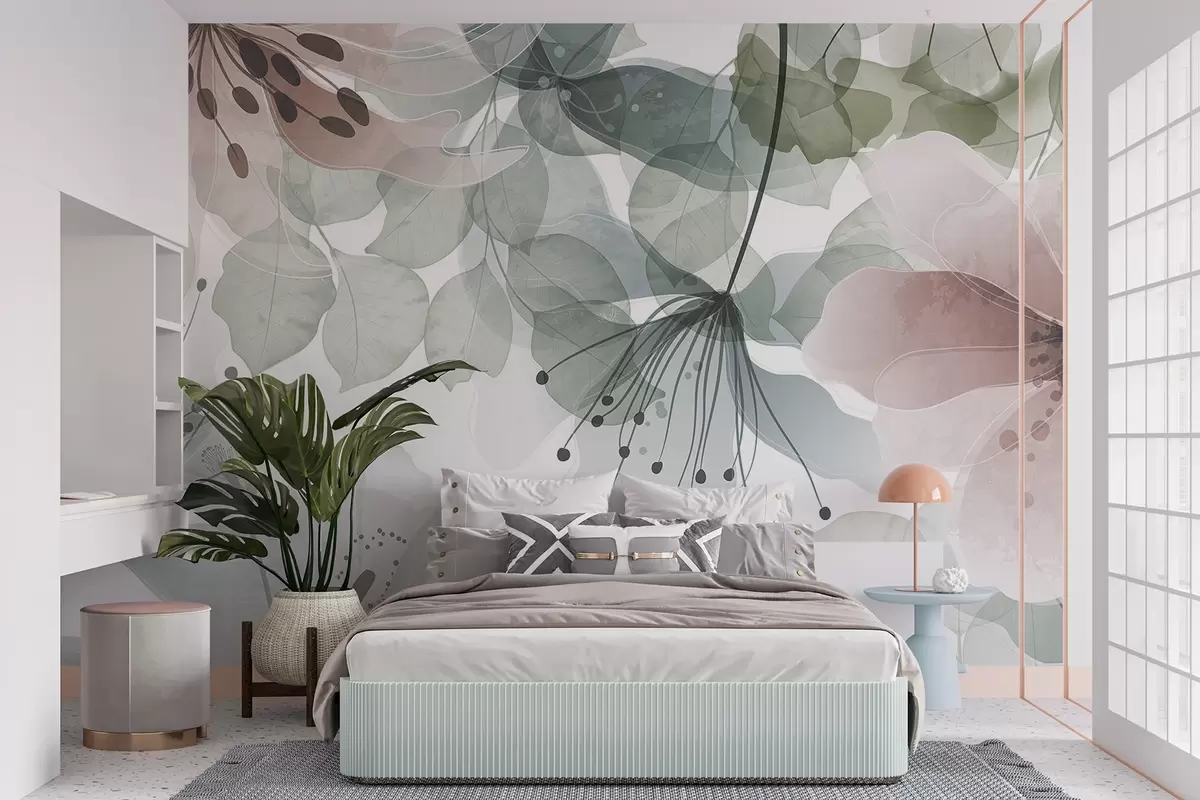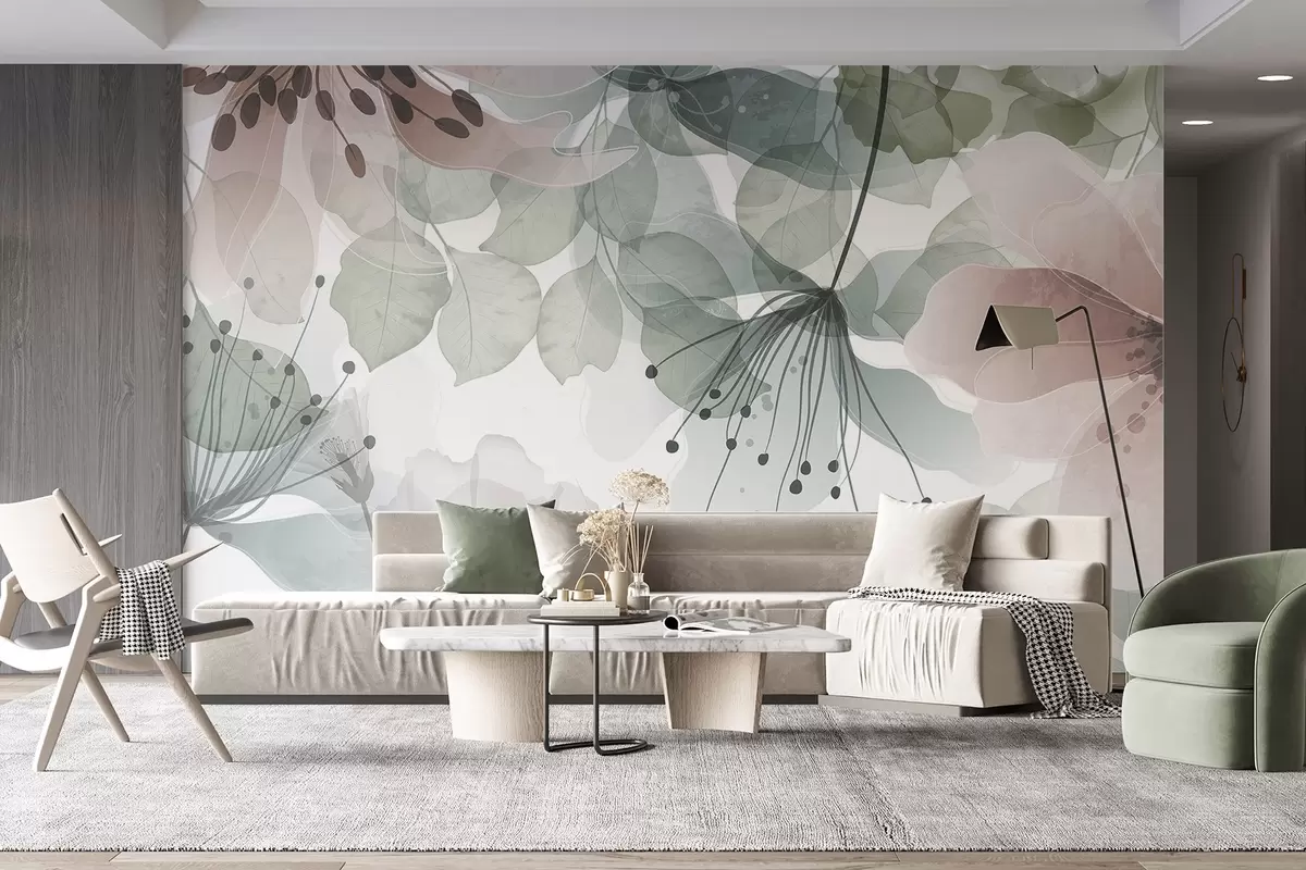 Peintures murales Fleurs et feuilles aux couleurs pastel, pétales et feuilles translucides, effet aquarelle doux, lignes délicates, fond blanc Nr. w09107