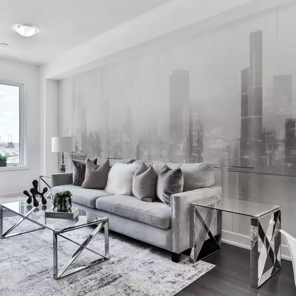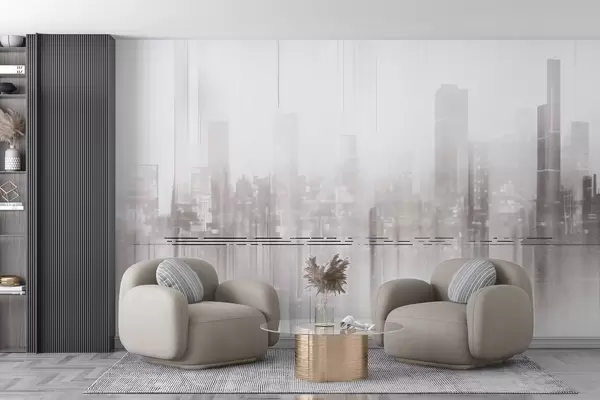 Peintures murales Paysage urbain abstrait texturé avec de grands bâtiments et des bandes, dans des tons de gris et de blanc, créant un effet de brume Nr. w09119