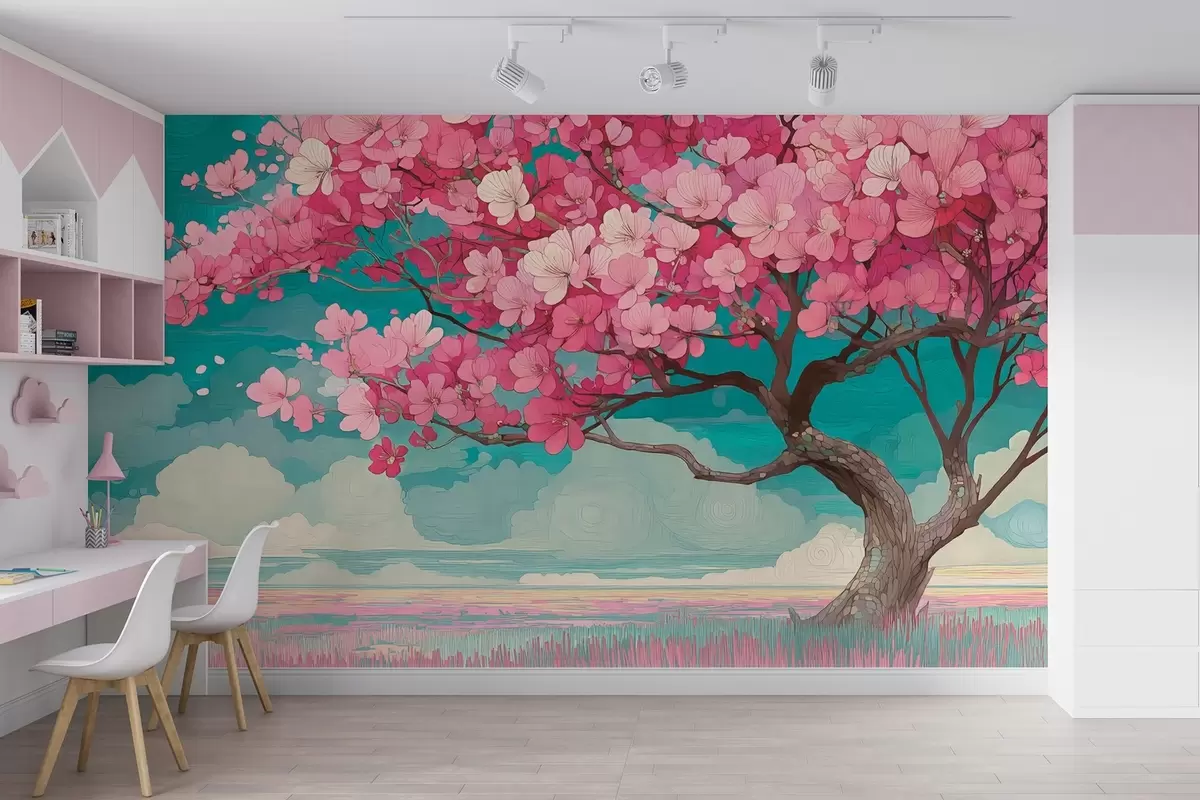 Peintures murales Un cerisier rose avec des pétales qui tombent et un ciel bleu dans un style romantique Nr. w09120